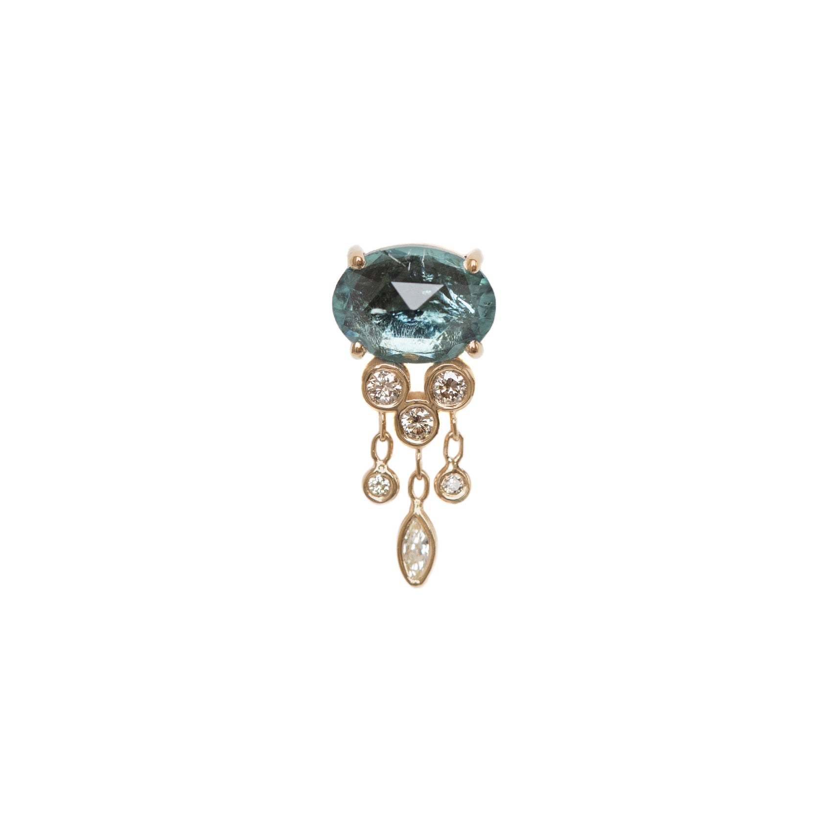Glow with the flow in this single, 14k yellow gold earring from Celine Daoust. A faceted oval blue-green tourmaline is set in prongs with bezel set diamond dangles. Total length measures 5/8". Single stud only. Handcrafted in Belgium.