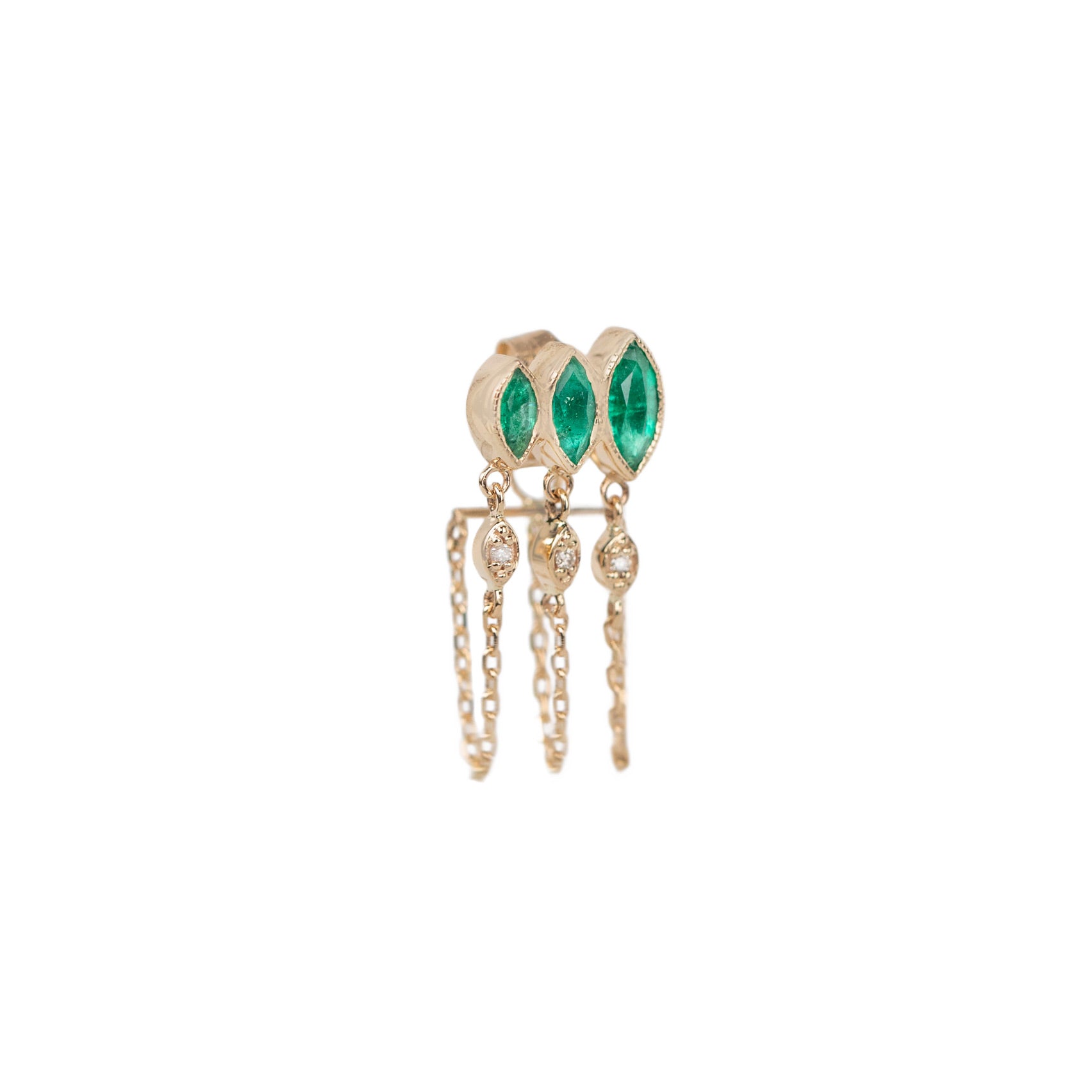 Triple your heart energy in this single, 14k yellow gold chain stud from Celine Daoust. Three graduating bezel set emeralds totaling 0.37cttw feature dangling white diamonds totaling 0.02cttw. Each chain connects to the stud back for a hoop-like feel. Single stud only. Total length measures 3/4". Handcrafted in Belgium.