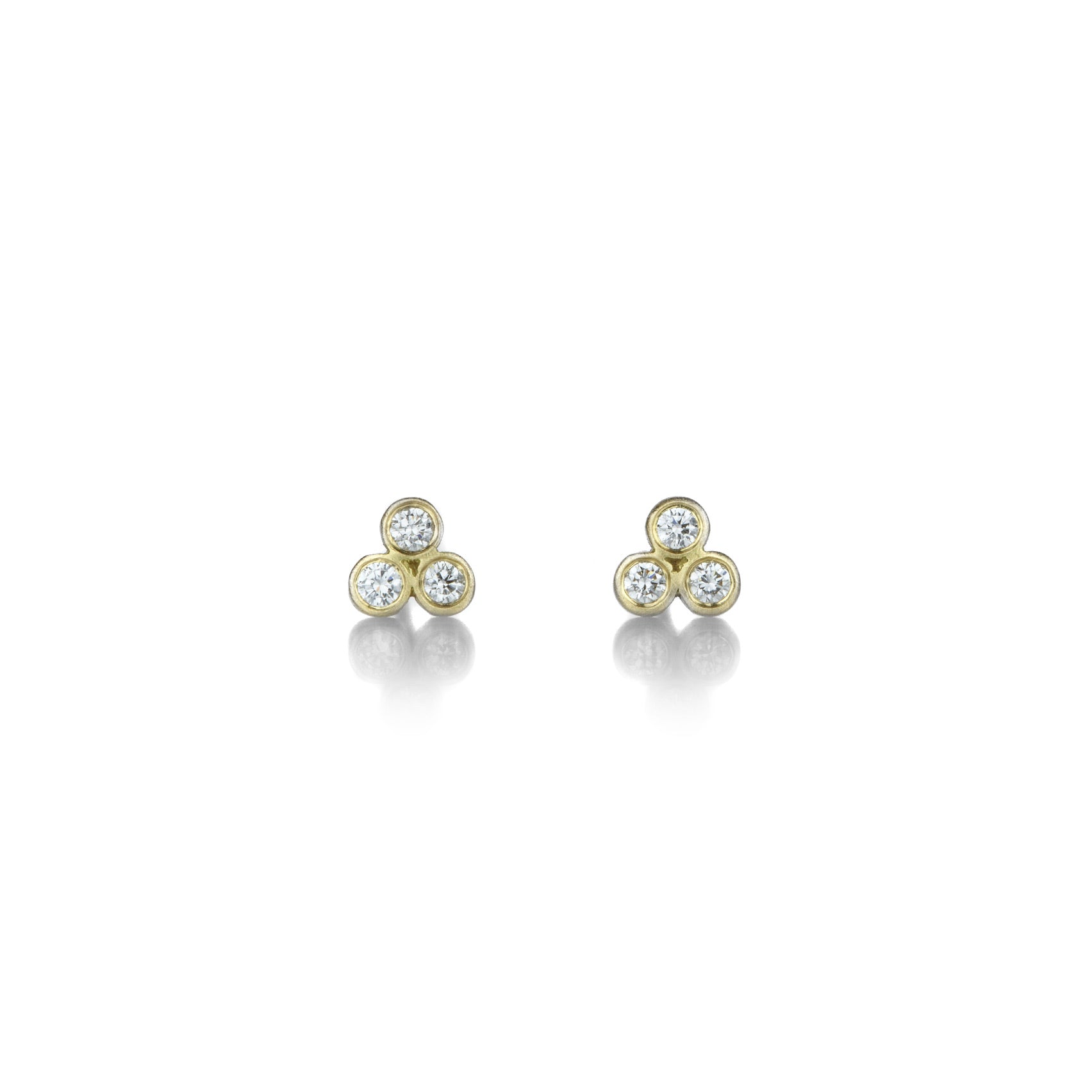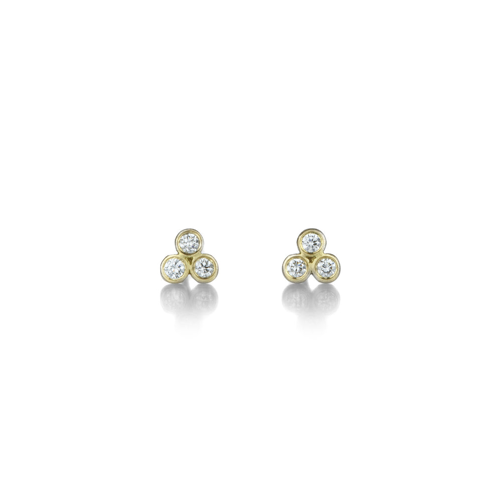 A minimalist design with that magical diamond spark, this pair of 18k yellow gold studs from Marian Maurer stars teeny triple diamonds totaling 0.14cttw. Dot your everyday look with this fun set! Studs measure just under 1/4“ in diameter. Handcrafted in Brooklyn, NY, U.S.