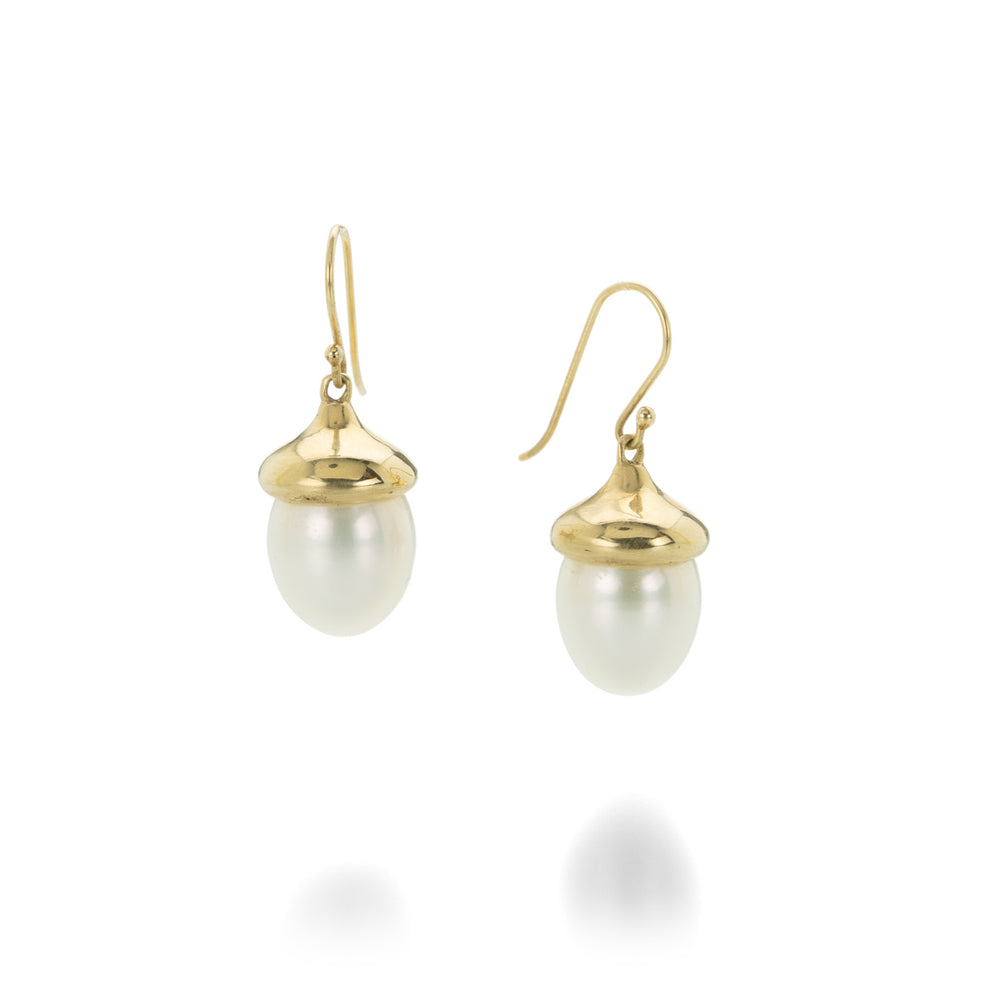 A fresh, natural pair of pearl drops is made even more beautiful with the imaginative artistic flair from Annette Ferdinandsen. Crafted in 14k yellow gold, the white pearls are capped with acorn tops. Total length with curved ear wires measures 1". Handcrafted in Hudson Valley, NY, U.S.
