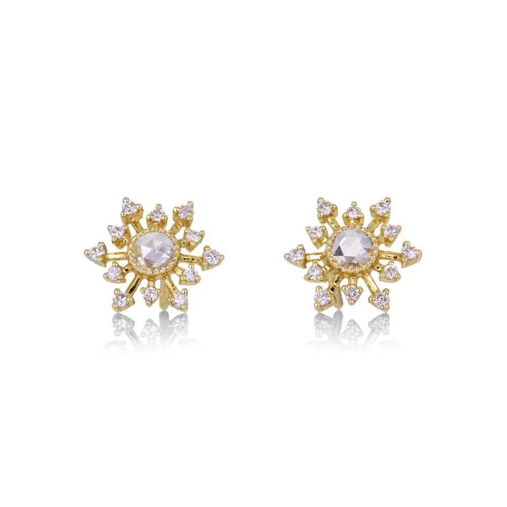 Let your light burst forth in this pair of 18k yellow gold earrings from Sethi Couture! The sparkly studs feature center rose cut diamonds with radiating brilliant cut diamond rays. Earrings measure 3/8" in diameter. Handcrafted in Indore, India.