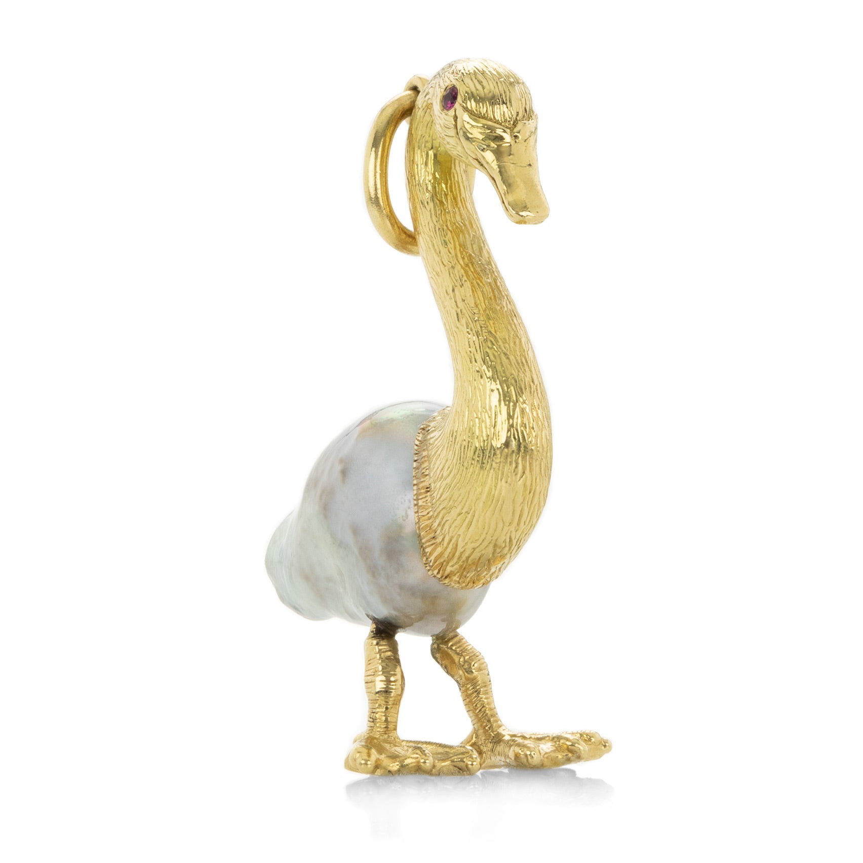 Embrace the element of surprise in this artfully imagined 18k yellow gold pendant from Fannie Thomas! A 14.4mm x 24.3mm gray Tahitian pearl has been elegantly embellished with a golden neck and legs to become a graceful swan. The powerful, curious creature features meticulously carved detailing and ruby eyes. Pendant measures 2” with bail. Pendant only, chain is sold separately. Handcrafted in San Antonio, TX, U.S.