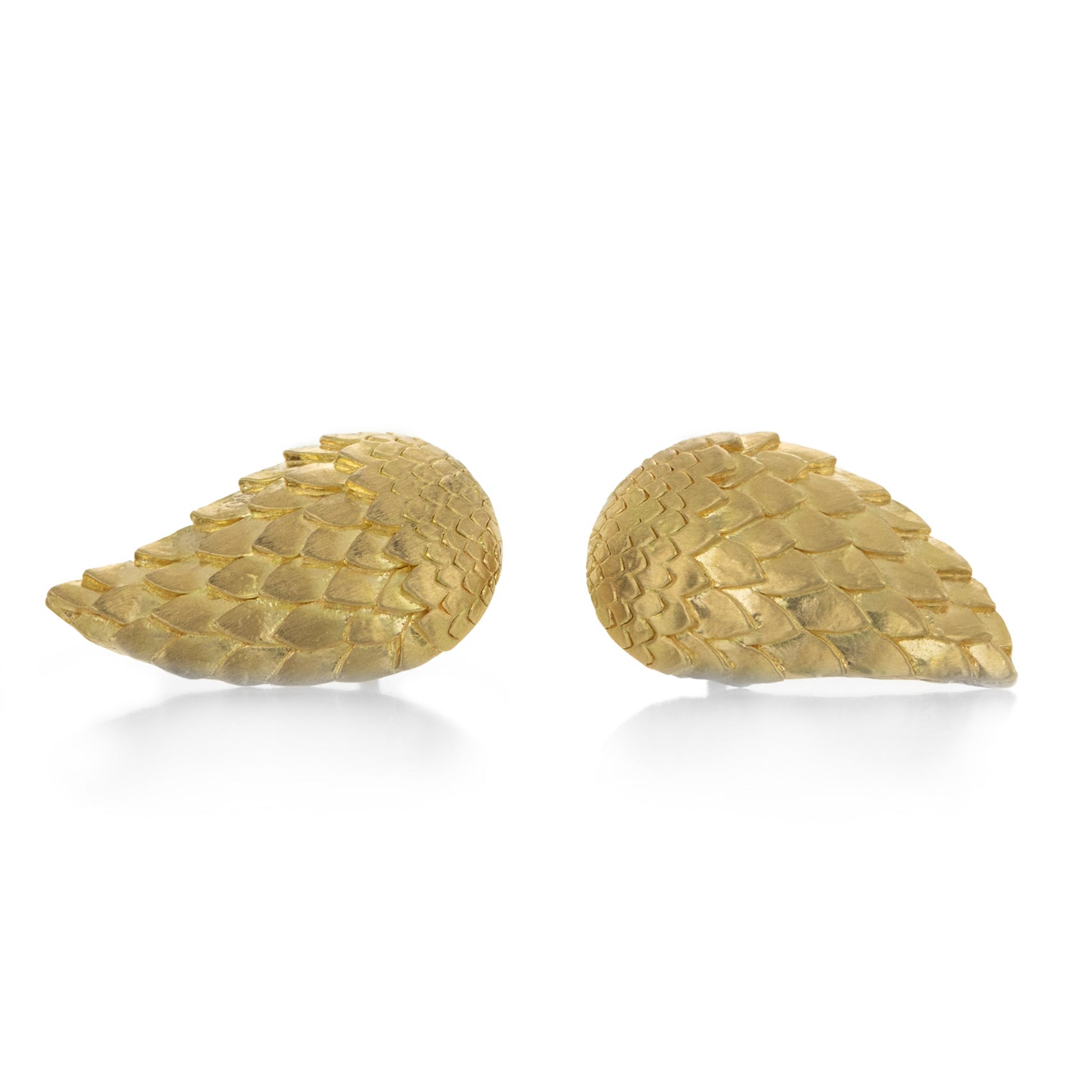 Fill your ears with the eloquent whisper of golden wings in this pair of 18k yellow gold studs from Fannie Thomas. Delicately carved layers of feathers rest beautifully upon the lobe. Studs measure 3/4" x 3/8". Handcrafted in San Antonio, TX, U.S.