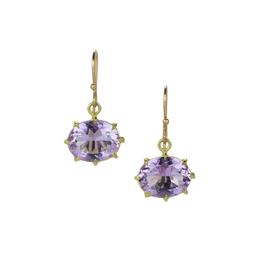 Sparkling in their minimalist beauty, these ethereal earrings from Rosanne Pugliese are just the right blend of simple and stunning. Crafted in 18k yellow gold, small faceted oval lavender amethyst are snuggled east-west in multi-prong settings. Total length with curved ear wires measures 7/8". Handcrafted in Brooklyn, NY, U.S.
