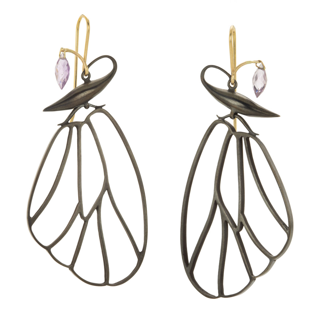 Butterfly Cell Wing Earrings with Amethyst Drops