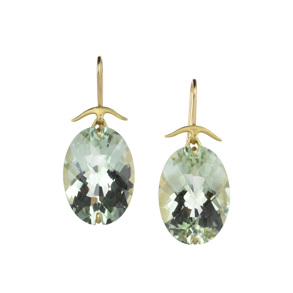 Freshen up your look in this pair of 18k yellow gold earrings from Gabriella Kiss. Featuring faceted oval pale green amethyst drops, these earrings are cool, calm and collected, not to mention beautiful. Total length with arch curved ear wires measures 1 1/4”. Handcrafted in Hudson Valley, NY, U.S.