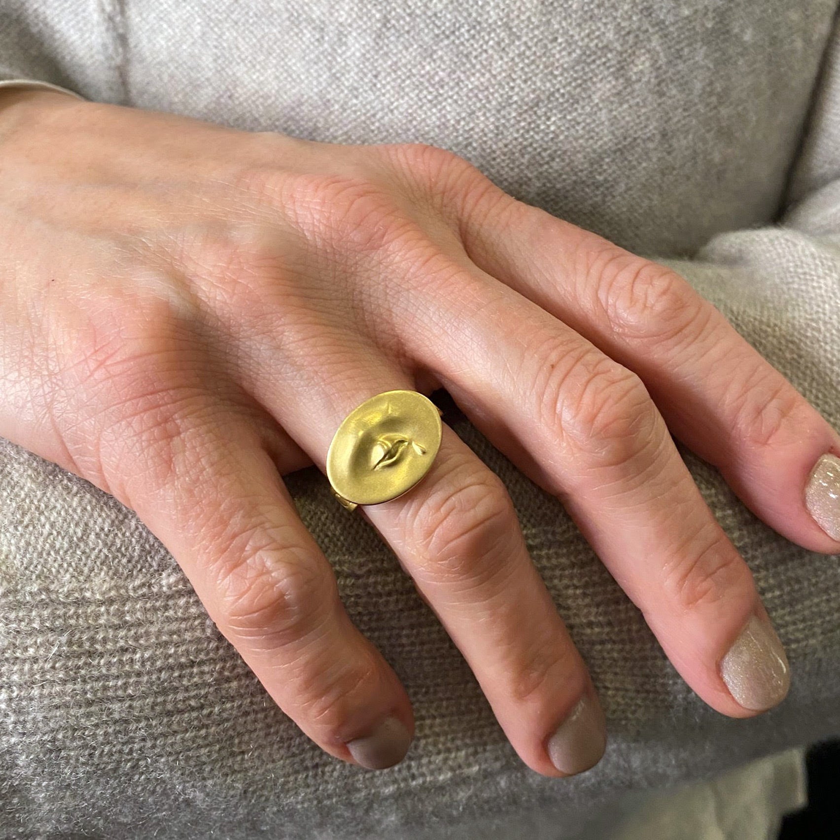 Part of her Love Token series, this 18k yellow gold ring from Gabriella Kiss features a watery eye. Find your own personal meaning in this detailed depiction of sweet sacrifice. An engraving on the band reads "Nil Nisi Cruce", Latin for "Nothing Without Suffering". Size 6.5. Handcrafted in Hudson Valley, NY, U.S.