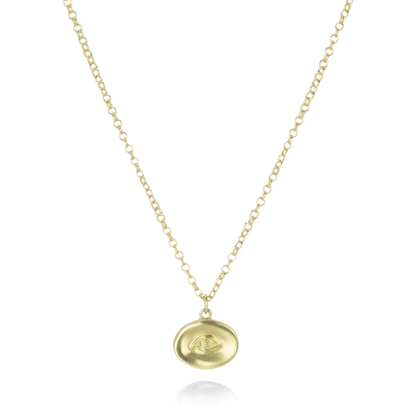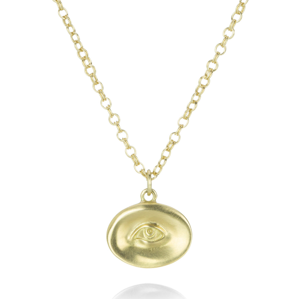Part of her Love Token series, this Gabriella Kiss necklace is handcrafted entirely in 18k yellow gold. Featuring a small, detailed lover's eye pendant, a 16" chain with a lobster claw clasp completes the piece. Pendant measures 1/2" x 3/8". Handcrafted in Hudson Valley, NY, U.S.