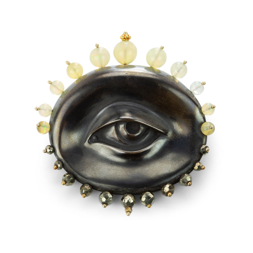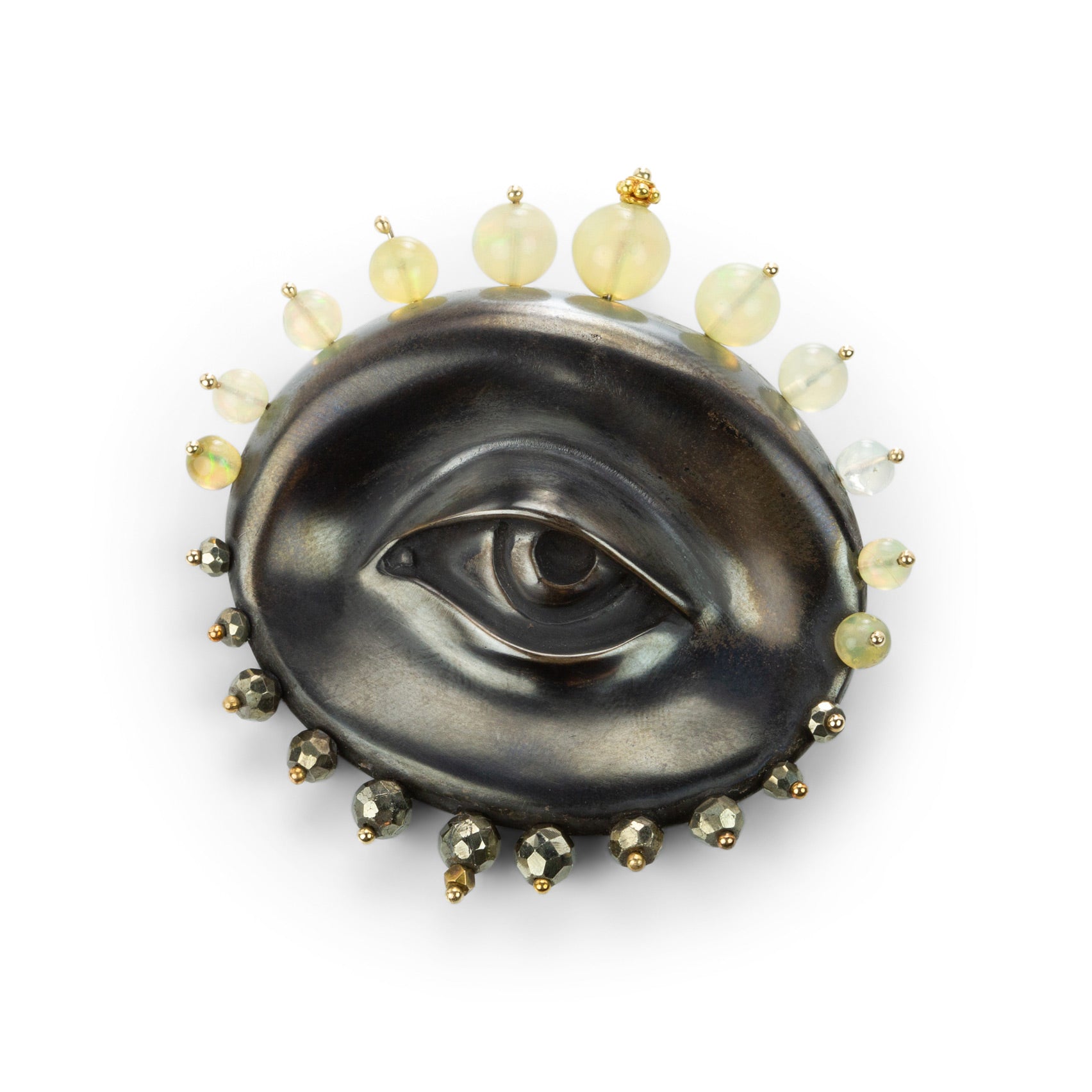 Spotted by collectors from miles away, this Gabriella Kiss brooch is a truly special piece. The bronze and 18k yellow gold eye is beautifully decorated with a perimeter of Ethiopian opal beads and faceted pyrite beads. Inspired by 'Lovers' Eye' miniatures, this pin is a true conversation starter! The brooch measures 2" x 2". Handcrafted in Hudson Valley, NY, U.S.