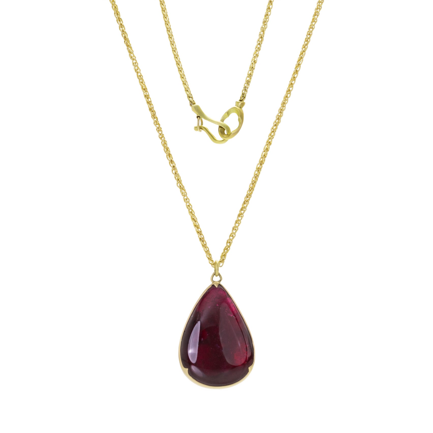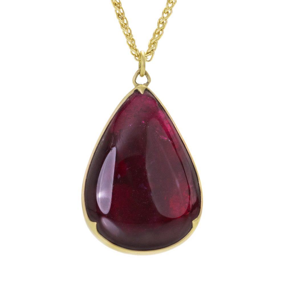 Almost juicy enough to eat, this brilliant 18k yellow gold necklace from Gabriella Kiss features a pear shaped deep pink tourmaline cabochon, set in the artist’s signature scalloped bezel. A bold statement of passion and love. Pendant measures 1 1/8” x 7/8”. Handcrafted in Hudson Valley, NY, U.S.