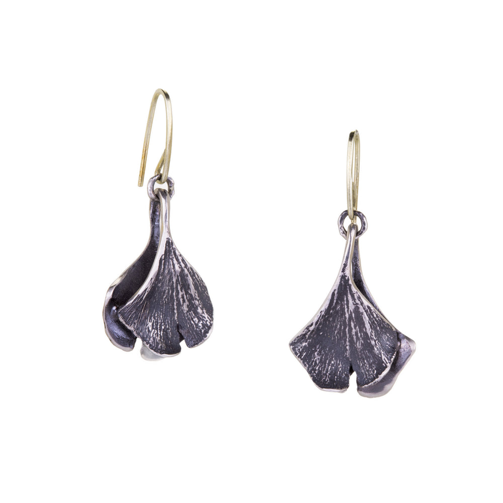 Oxidized sterling silver small double ginkgo leaf earrings on a 14k yellow gold ear wire. Earring measures 1 1/4" long. Handcrafted in East Hampton, NY, U.S.
