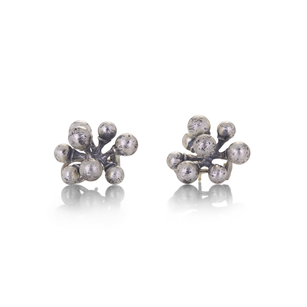 Playful and dramatic, John Iversen’s jacks earrings are a contemporary twist on the childhood game. Meticulously crafted in oxidized sterling silver, these 5-6mm silver bead studs are like tiny sculptures for your ears!. Earrings measure approximately 7/8” x 3/4” with secure 18k gold post and clip backs. Handcrafted in East Hampton, NY, U.S.