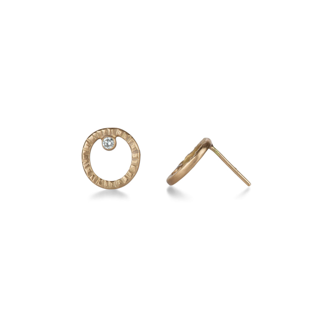 Celebrate the strength of the circle in this pair of 18k rose gold studs from Kate Maller. Bold flattened rings shimmer and shine, with bezel set diamonds totaling 0.06cttw hugging the inner rim. Studs measure 3/8" in diameter. Handcrafted in Denver, CO, U.S.