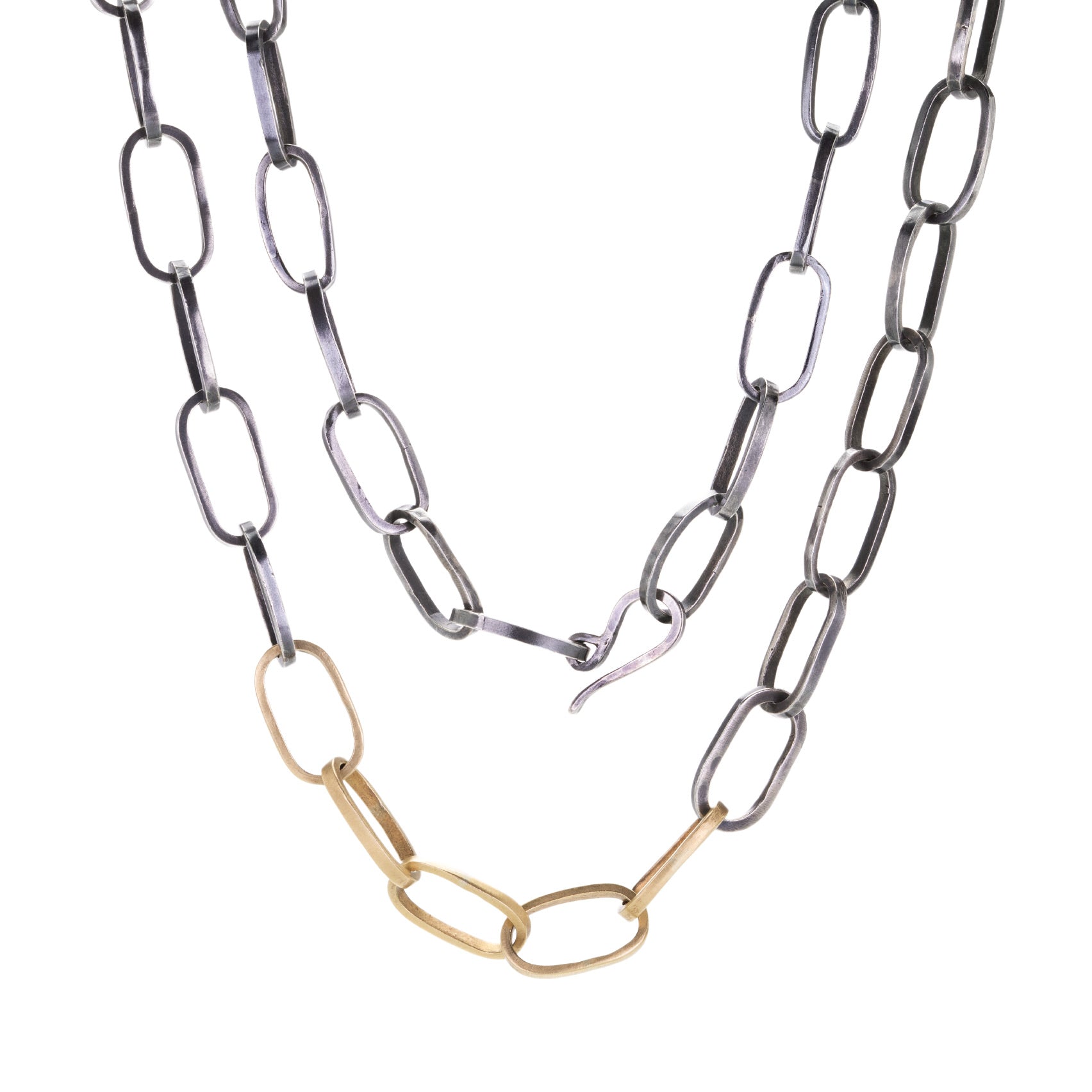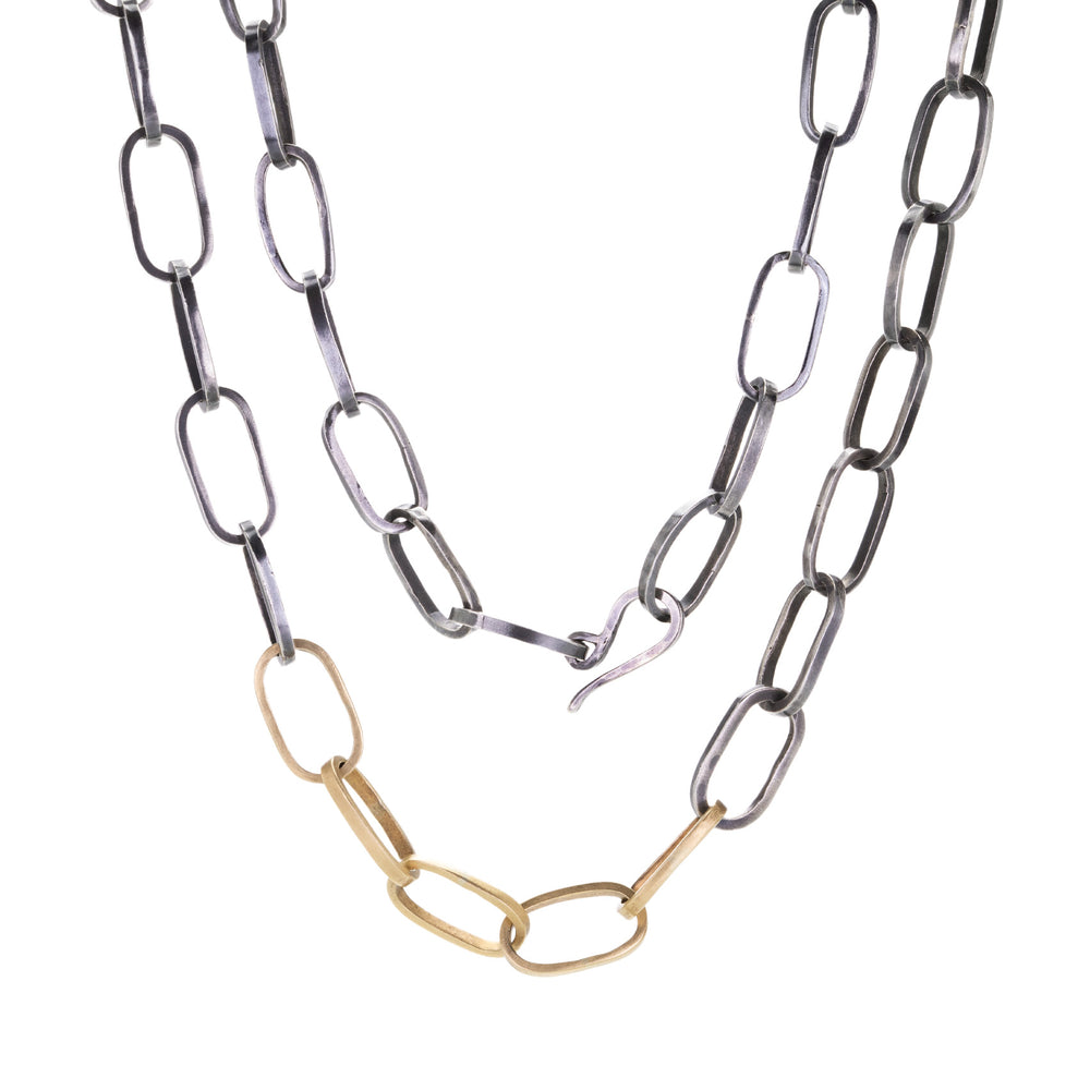 Elevate the simplicity of the chain to a whole new level of bold in this incredible statement necklace from Kate Maller. The heavyweight oxidized Argentium silver links are set off by five 18k yellow gold links at the center. Total length with hook clasp measures 26". Handcrafted in Denver, CO, U.S.