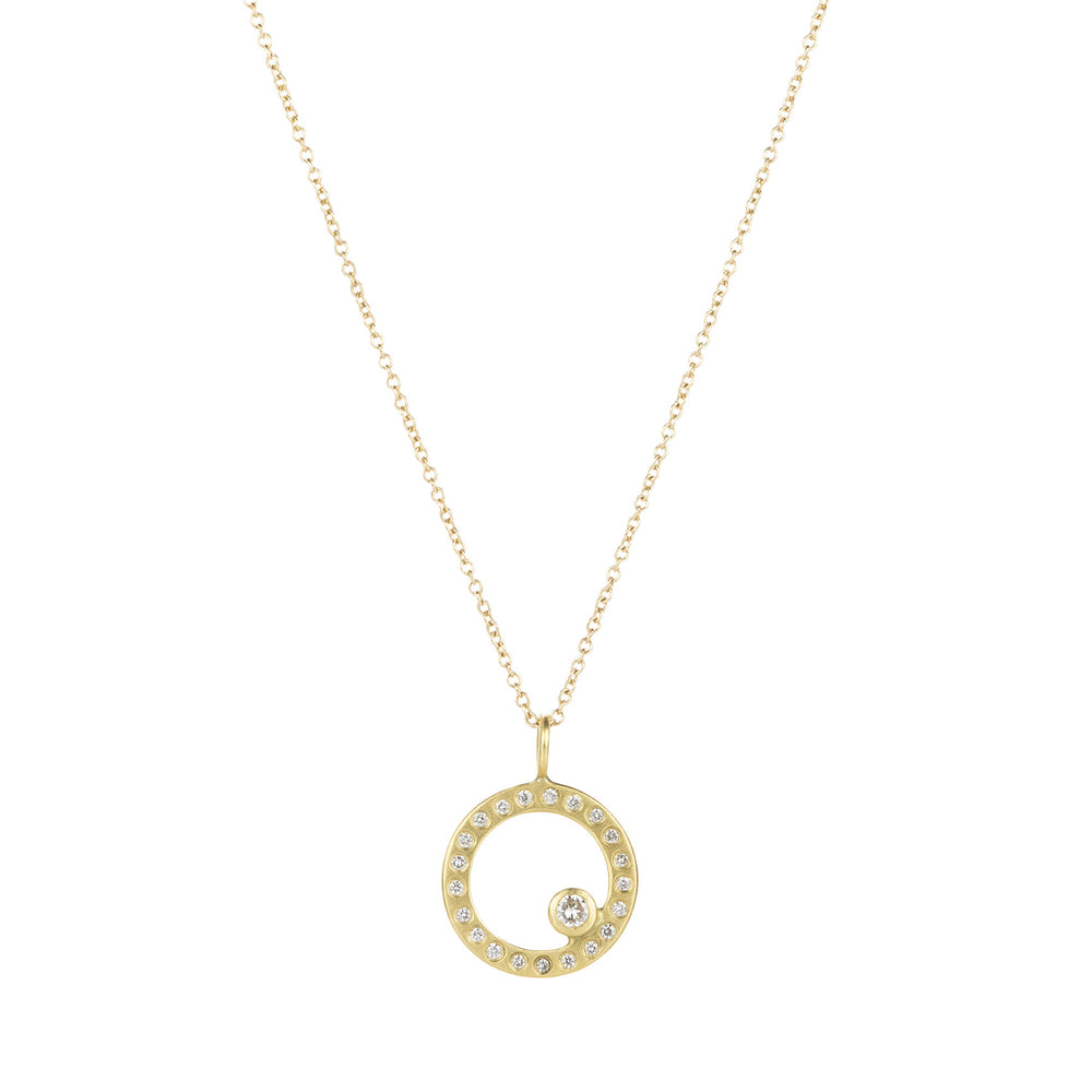 Ultra versatile and supremely wearable, this 18k yellow gold open circle necklace from Kate Maller features an inner satellite diamond and surface set VS quality diamonds totaling 0.29cttw. The perfect choice for everyday and night! Pendant length measures 3/4". Total 14k yellow gold chain length measures 16"-18" including S-clasp. Handcrafted in Denver, CO, U.S.
