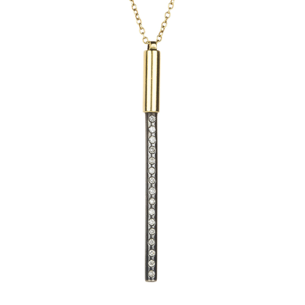 Connect to your own corner of a galaxy far, far away in this oxidized Argentium silver and 18k yellow gold stick pendant necklace from Kate Maller. Sixteen VS diamonds totaling 0.27cttw twinkle and dance like the stars. Pendant length measures just over 2". Total chain length measures 30" and features a 3 1/4" 18k yellow gold accent section. Handcrafted in Denver, CO, U.S.