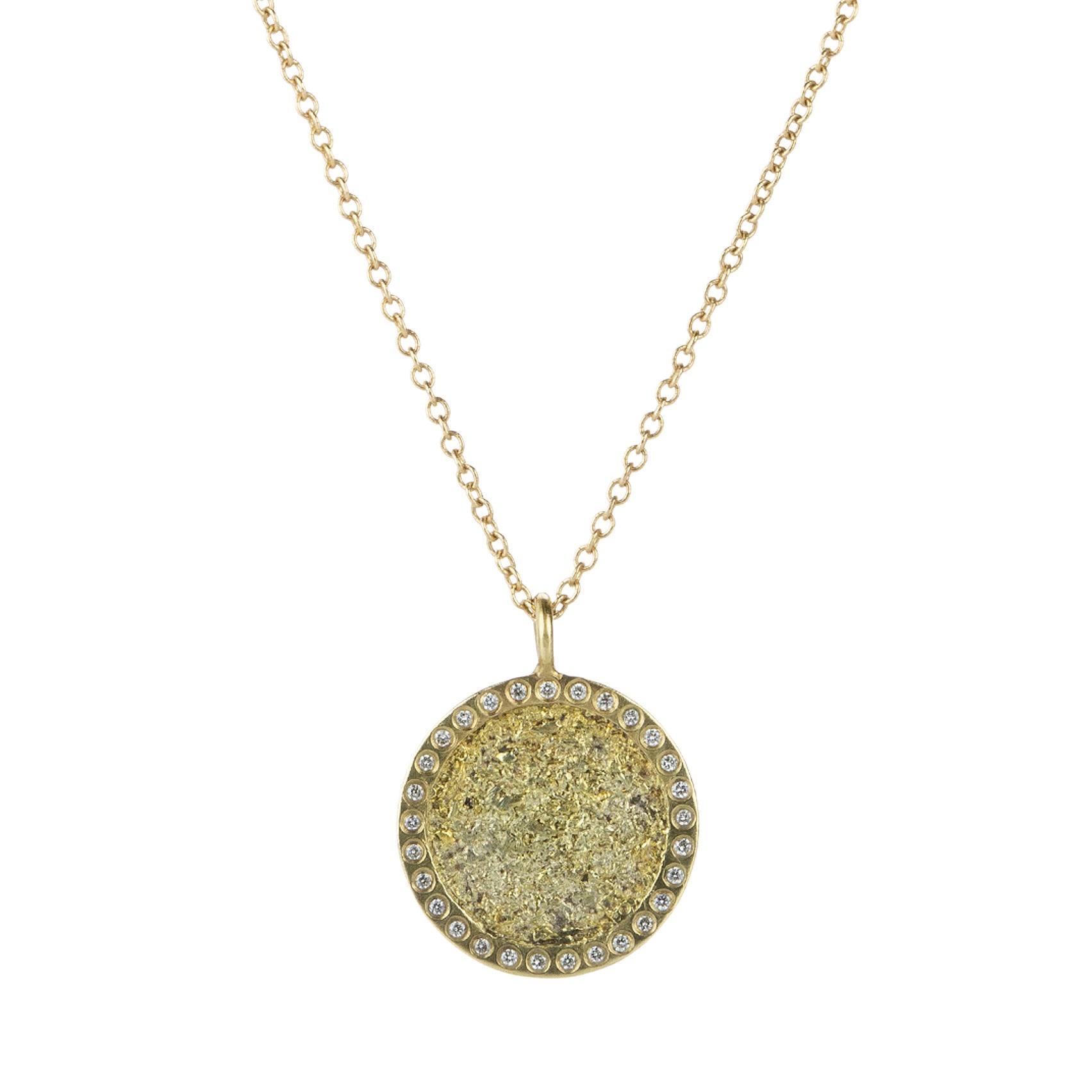Let the sun shine! This sparkling pendant necklace from Kate Maller is crafted in 18k yellow gold, 22k yellow gold dust and oxidized Argentium silver. White diamonds totaling 0.72cttw radiate from the center like the warmth of the sun. Pendant measures approximately 1/2" in diameter. Chain can be worn at 16” or 18”. Handcrafted in Denver, CO, U.S.