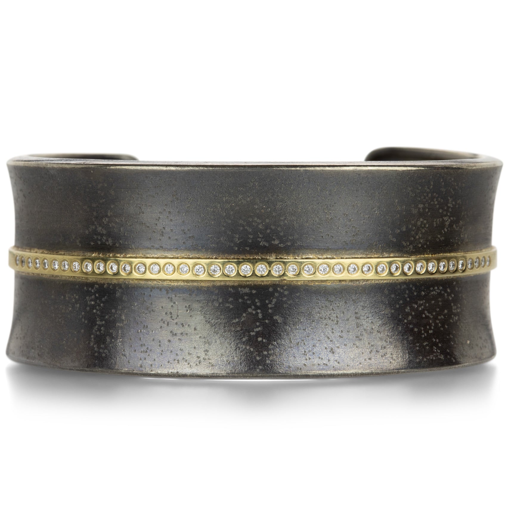 Break out the bold in this oxidized Argentium silver cuff from Kate Maller. A subtle, yet smooth, rounded texture to the surface is offset by a gleaming vein of 18k yellow gold and white diamonds totaling 0.36cttw. Cuff measures 1" wide. Inner diameter measures 2 1/8" x 1 3/4". Handcrafted in Denver, CO, U.S.