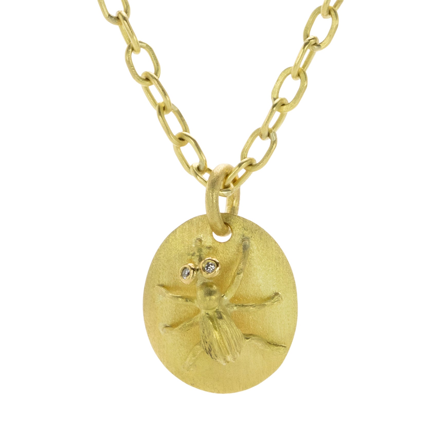 Lay your eyes on this sweet, whimsical bug pendant from Lene Vibe! A carved, animated 18k yellow gold bug is perched on a brushed oval disc, and sparkles with white diamond eyes totaling 0.02cttw. Keep this cutie with you and brighten everyone’s day! Pendant measures 7/8" x 5/8" including bail. Handcrafted in Denmark.