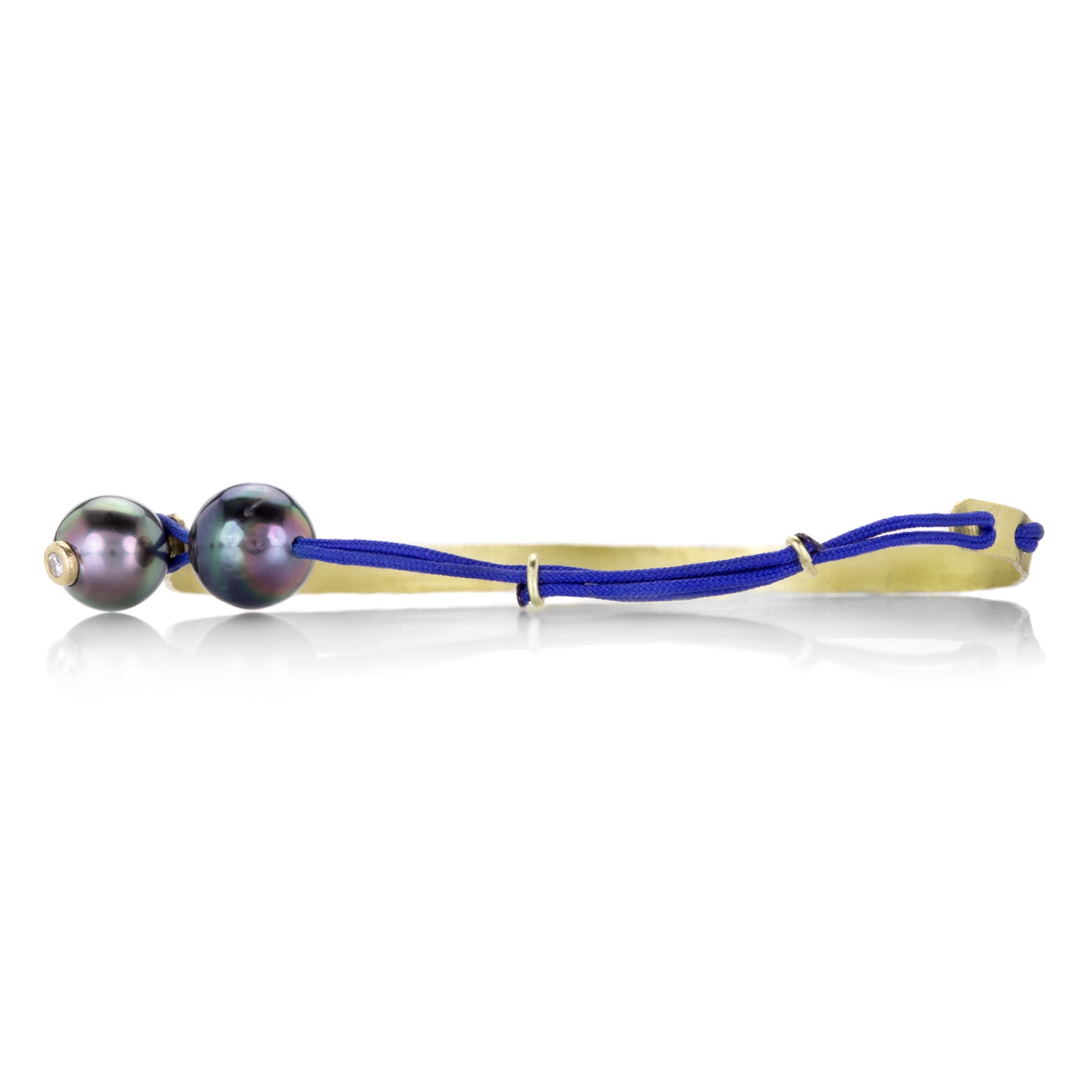 Explore a sense of artful minimalism in this 18k yellow gold bar bracelet from Lene Vibe. A simple blue nylon cord adds color and length versatility, with two Tahitian pearls at the clasp, one containing a bezel set, 0.03ct white diamond. Adjustable length. Handcrafted in Denmark.
