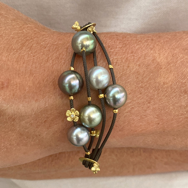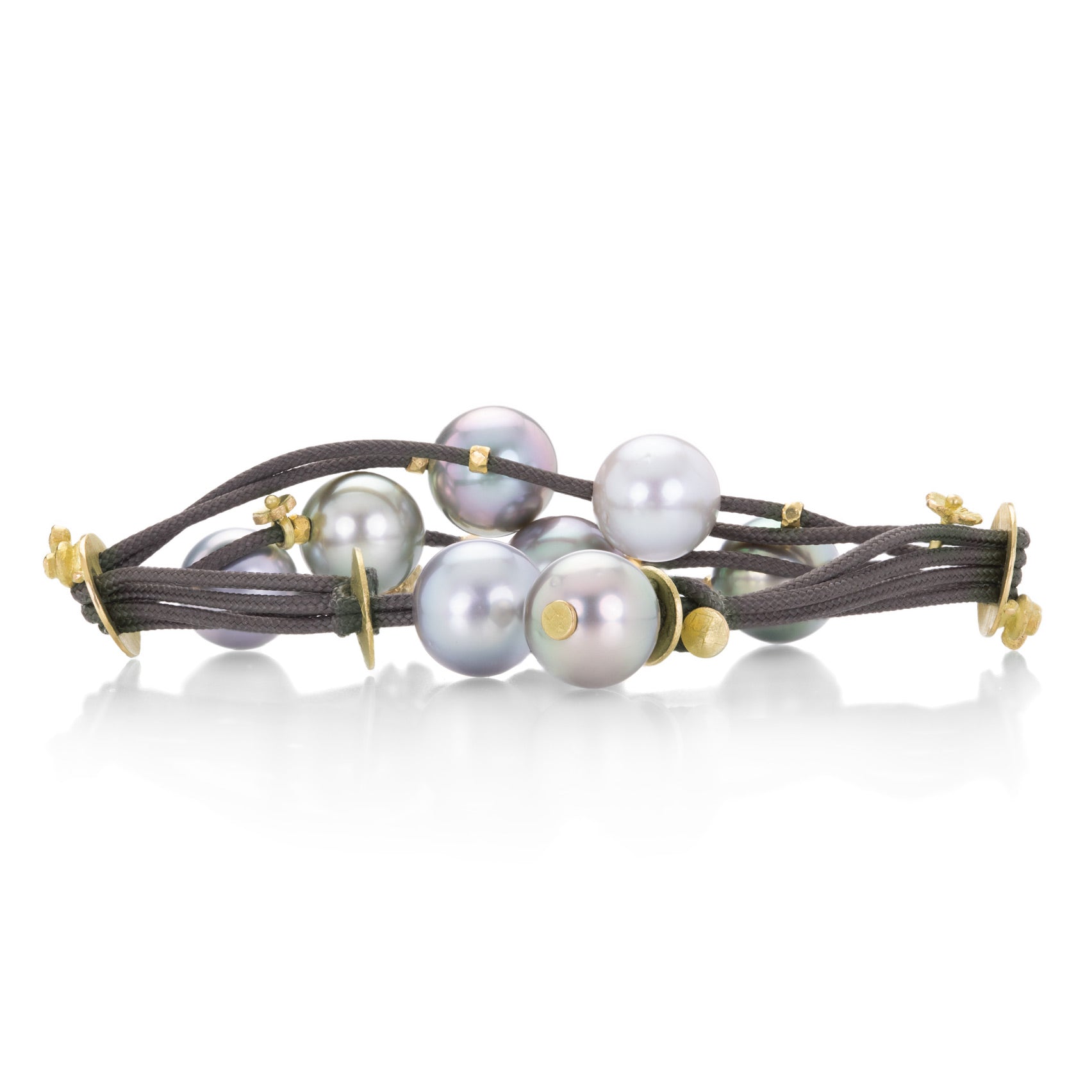 Set sail on a sea of earthly delights in this multi strand brown nylon cord bracelet from Lene Vibe. Eight Tahitian pearls mix and mingle with 18k yellow gold carved snail and flower elements with white diamonds totaling 0.07cttw. Total length with button style closure measures 7". Handcrafted in Denmark.
