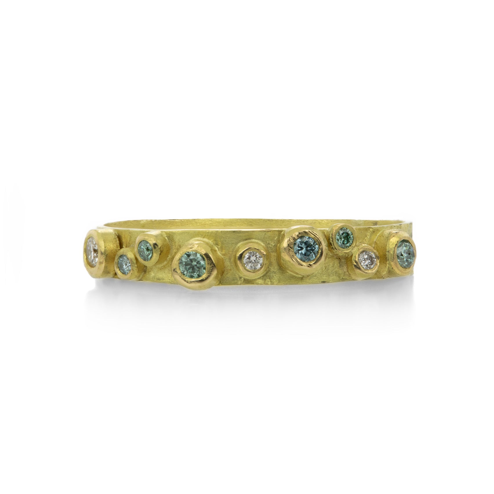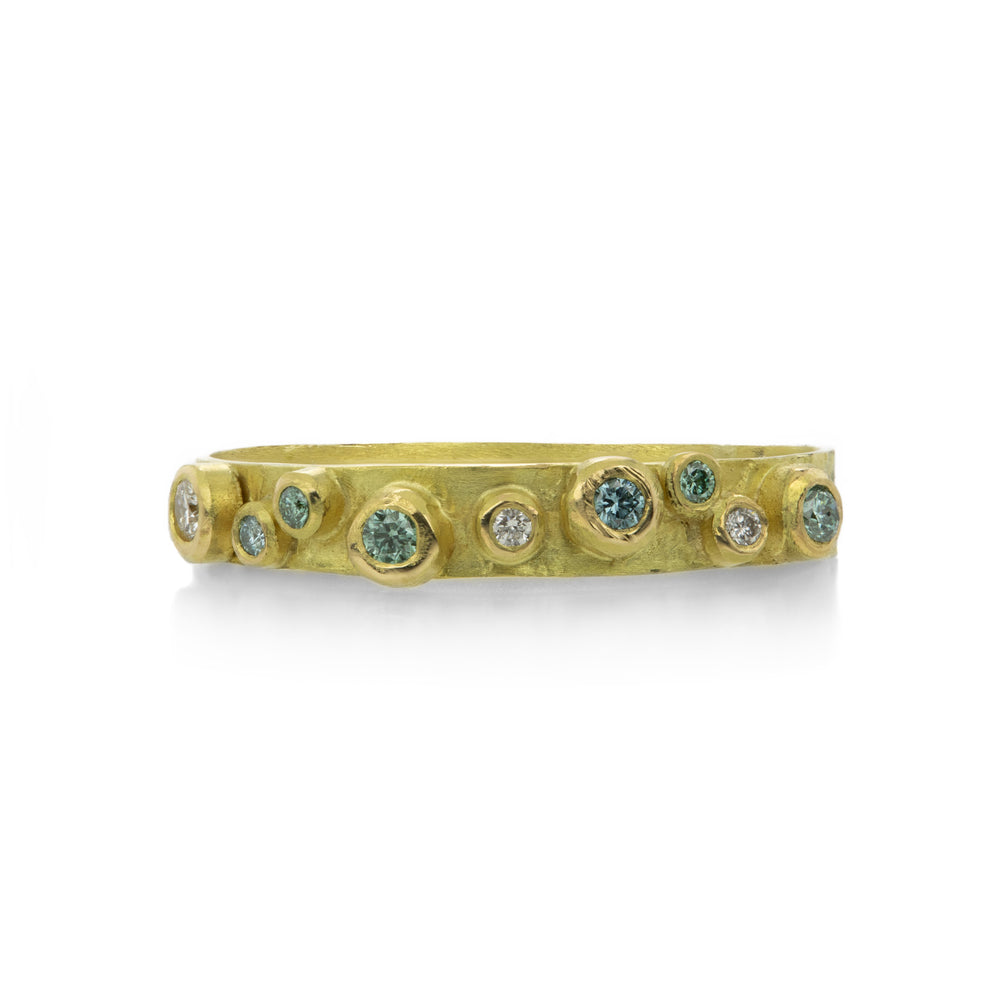 This fun, festive 18k yellow gold band from Lene Vibe will brighten any day! Multicolored diamonds totaling 0.14cttw are bezel set upon the hammered surface for a visual and textural delight! Band width measures 3.5mm. Size 8.75. Handcrafted in Denmark.