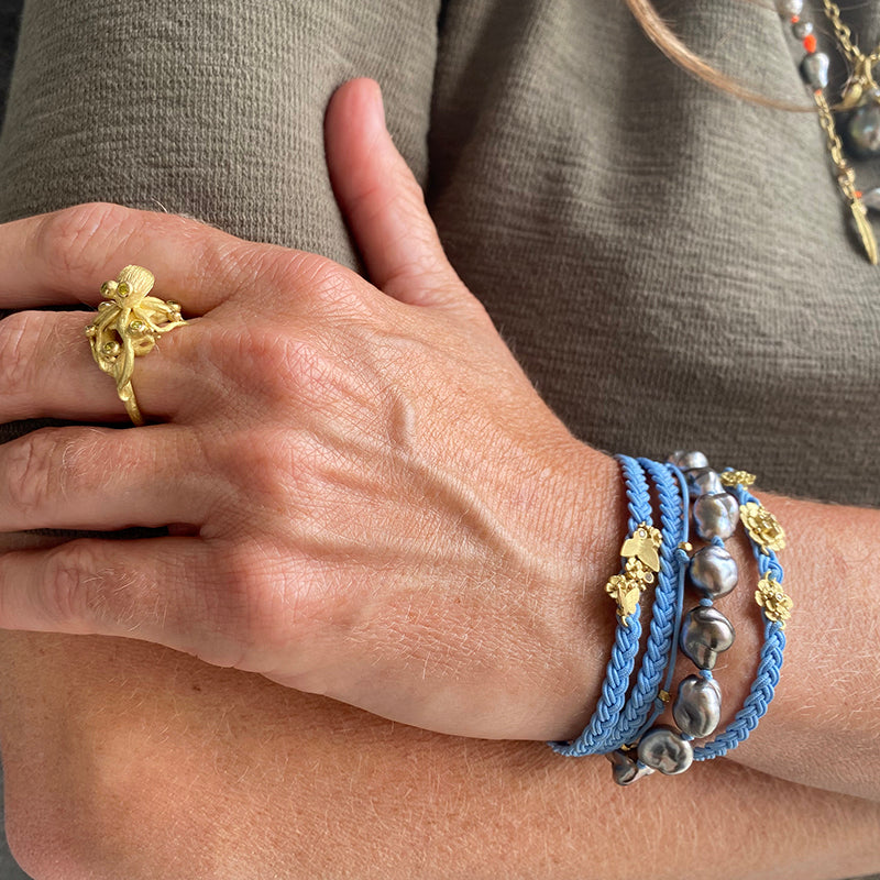 Delight in the intricate details of this sky blue braided nylon cord bracelet from Lene Vibe. 18k yellow gold detailed flowers and butterflies sparkle with bezel set white diamonds totaling 0.02cttw, set off by two Tahitian pearls at the button style clasp. Total length measures 6 1/2”. Handcrafted in Denmark.