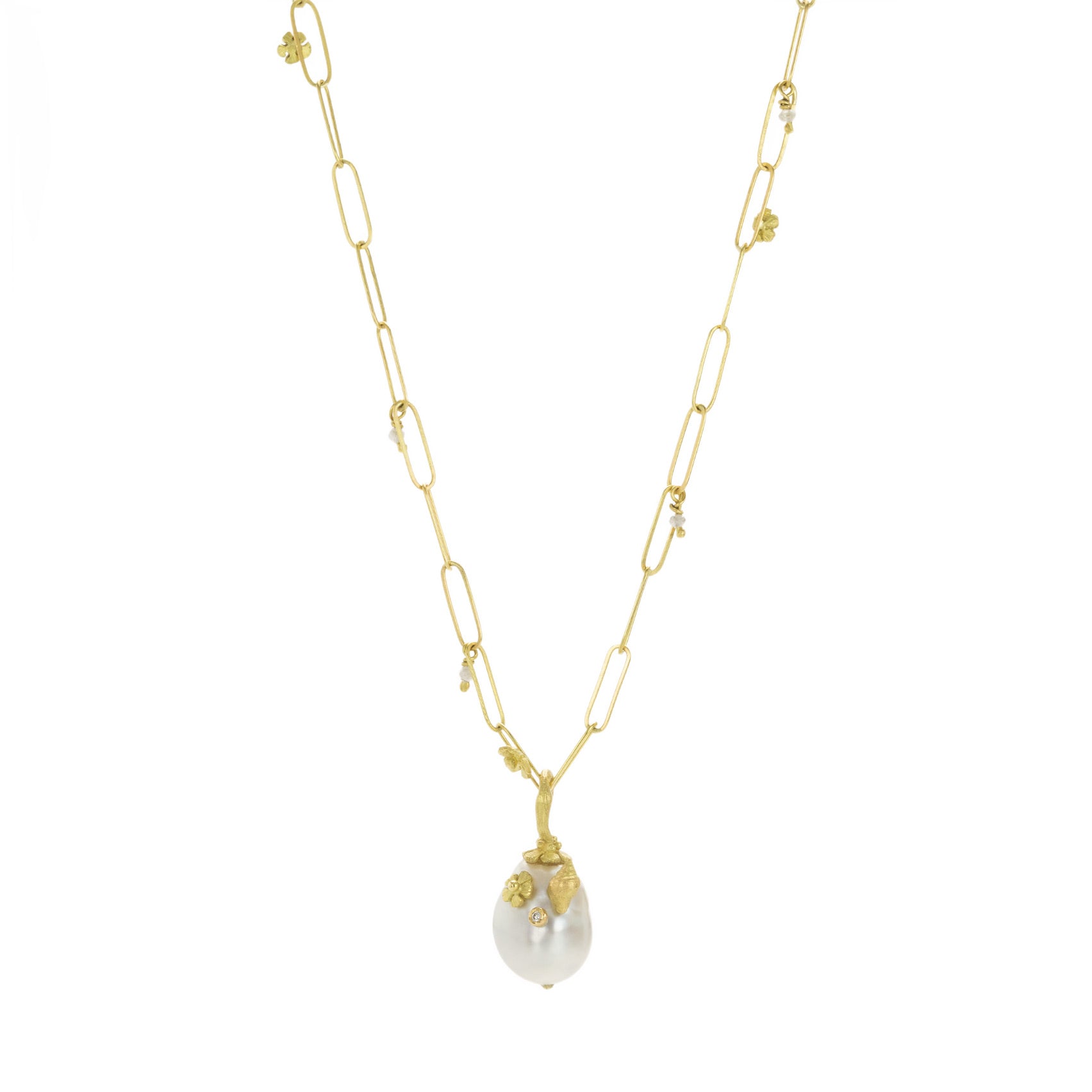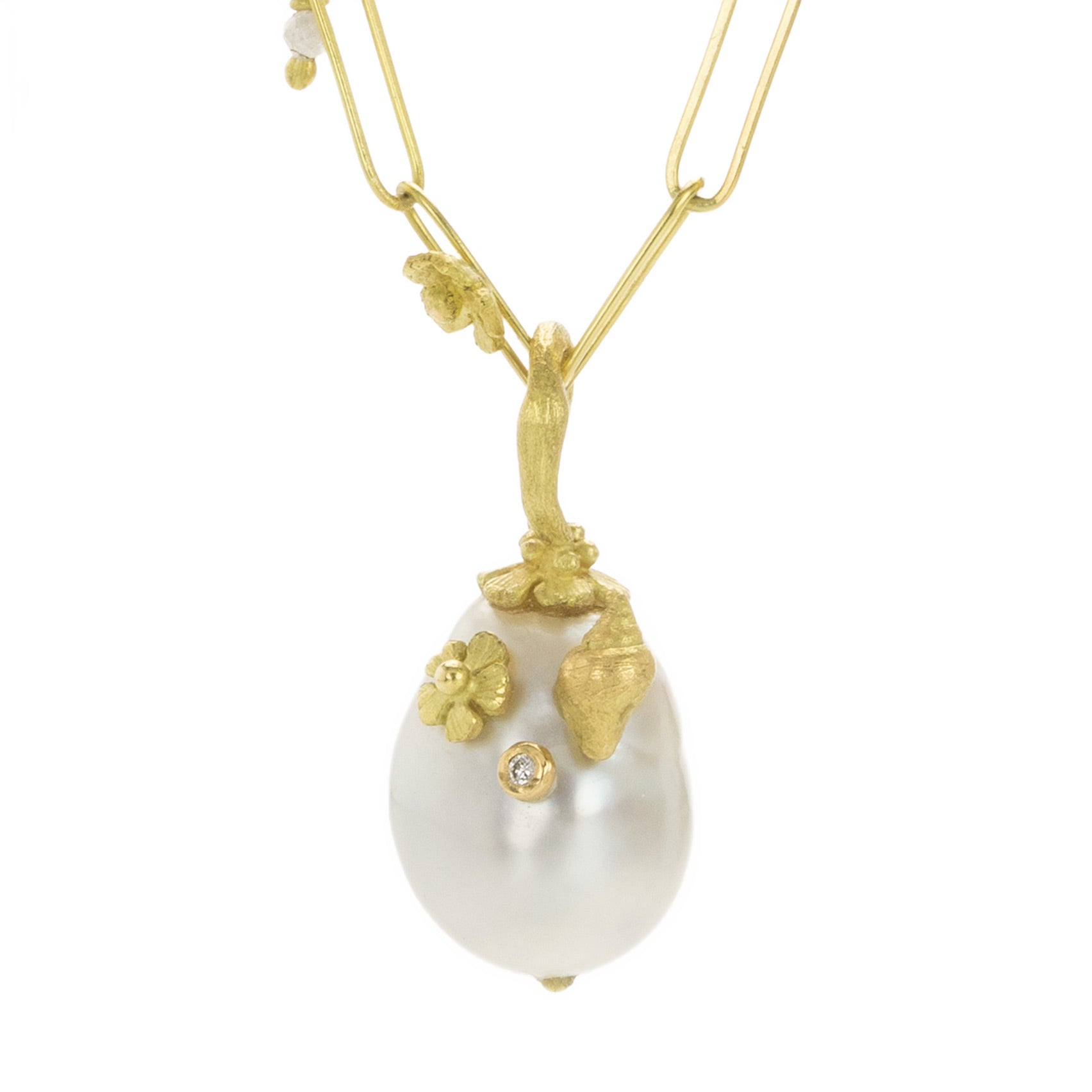 Inspired by the sea and the wondrous beauty that surrounds us, this 18k yellow gold pendant from Lene Vibe features a white Tahitian pearl with a delicately carved flower and shell on its surface. A bezel set 0.01ct diamond adds a spark. Total pendant length measures 1" including bail. Pendant only, chain is sold separately. Handcrafted in Denmark.