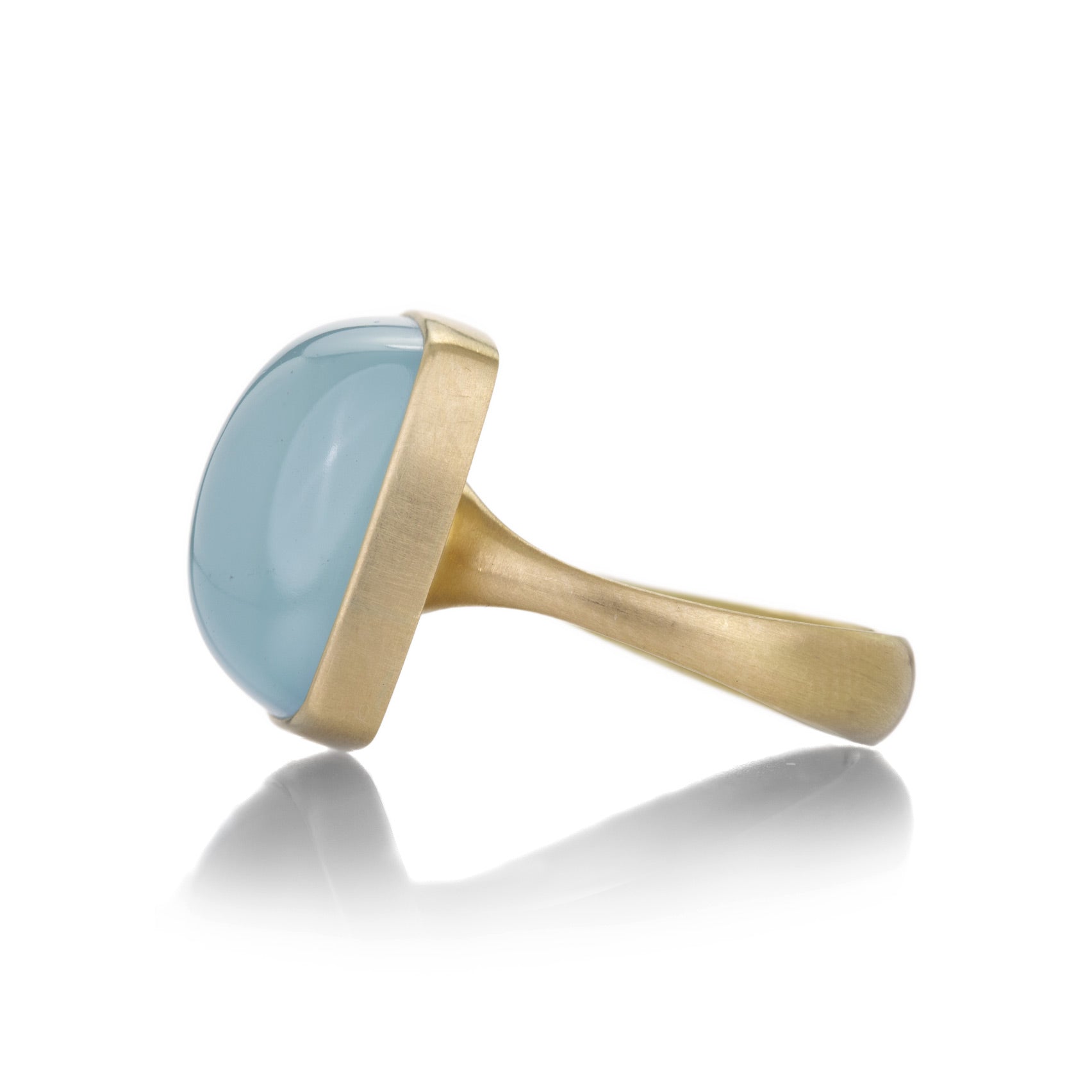 Open up a window to the world in this fresh, frosty 18k yellow gold ring from Lola Brooks. cushion shaped 14.88ct aquamarine cabochon is tucked into a brushed gold bezel. Stone measures 5/8" x 5/8” atop a slightly tapered brushed gold band. Size 6.5. Handcrafted in Lexington, GA, U.S.