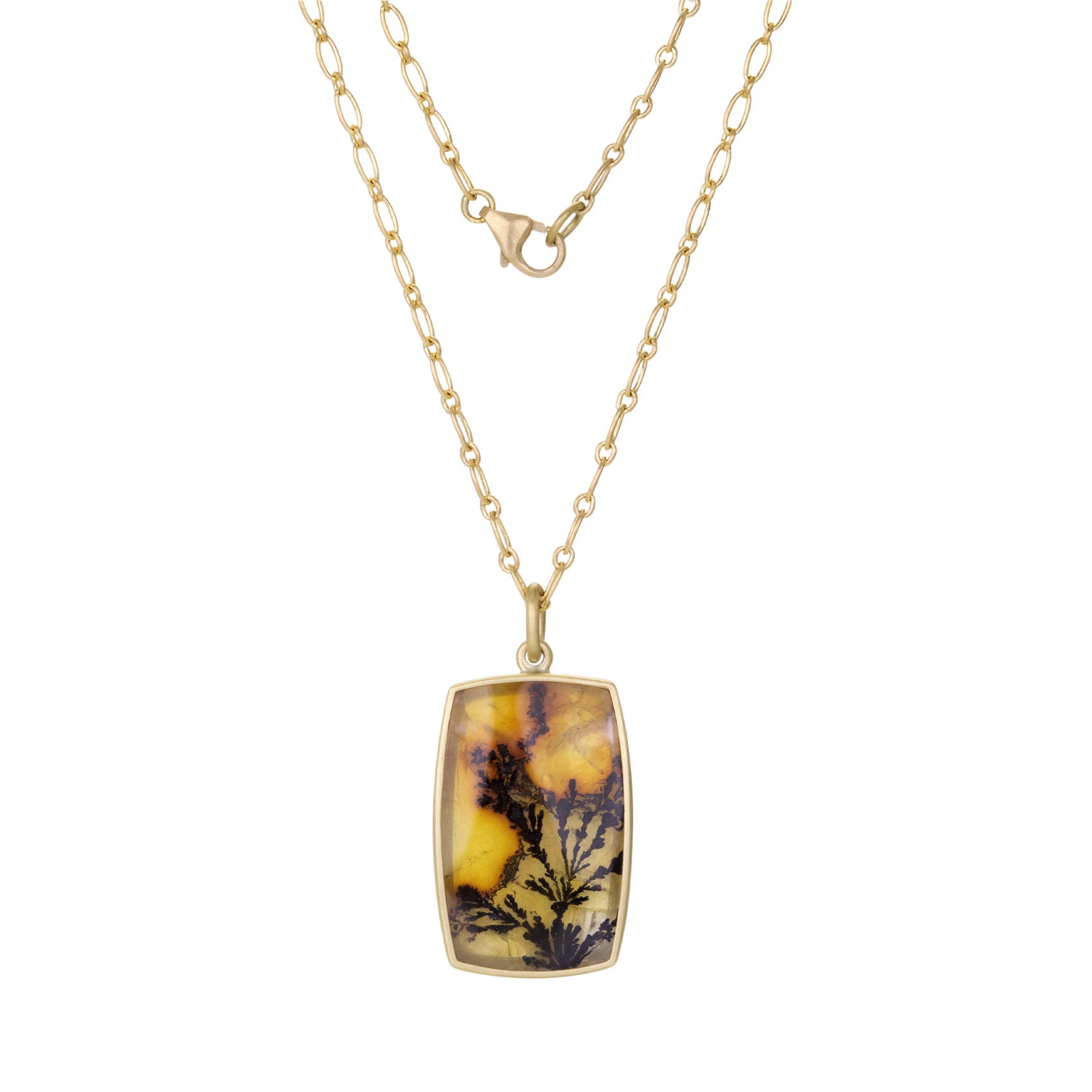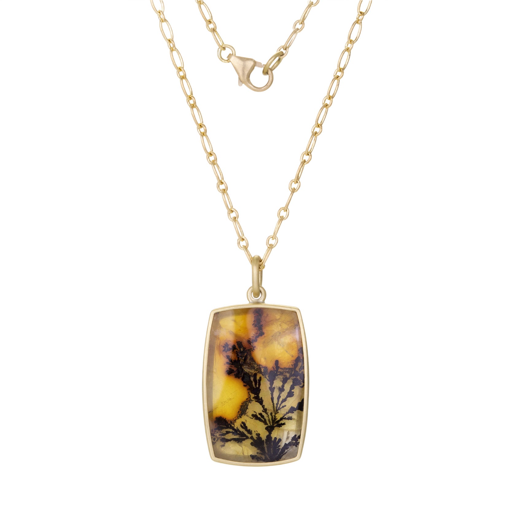 A tiny painting by mother nature inspires this 18k yellow gold necklace from Lola Brooks. A 13.05ct rounded rectangular dendritic quartz cabochon seems to glow from within. The simple brushed bezel setting lets the stone shine. Pendant measures 1 1/8" x 5/8" including bail. Total chain length with lobster clasp measures 18". Handcrafted in Lexington, GA, U.S.