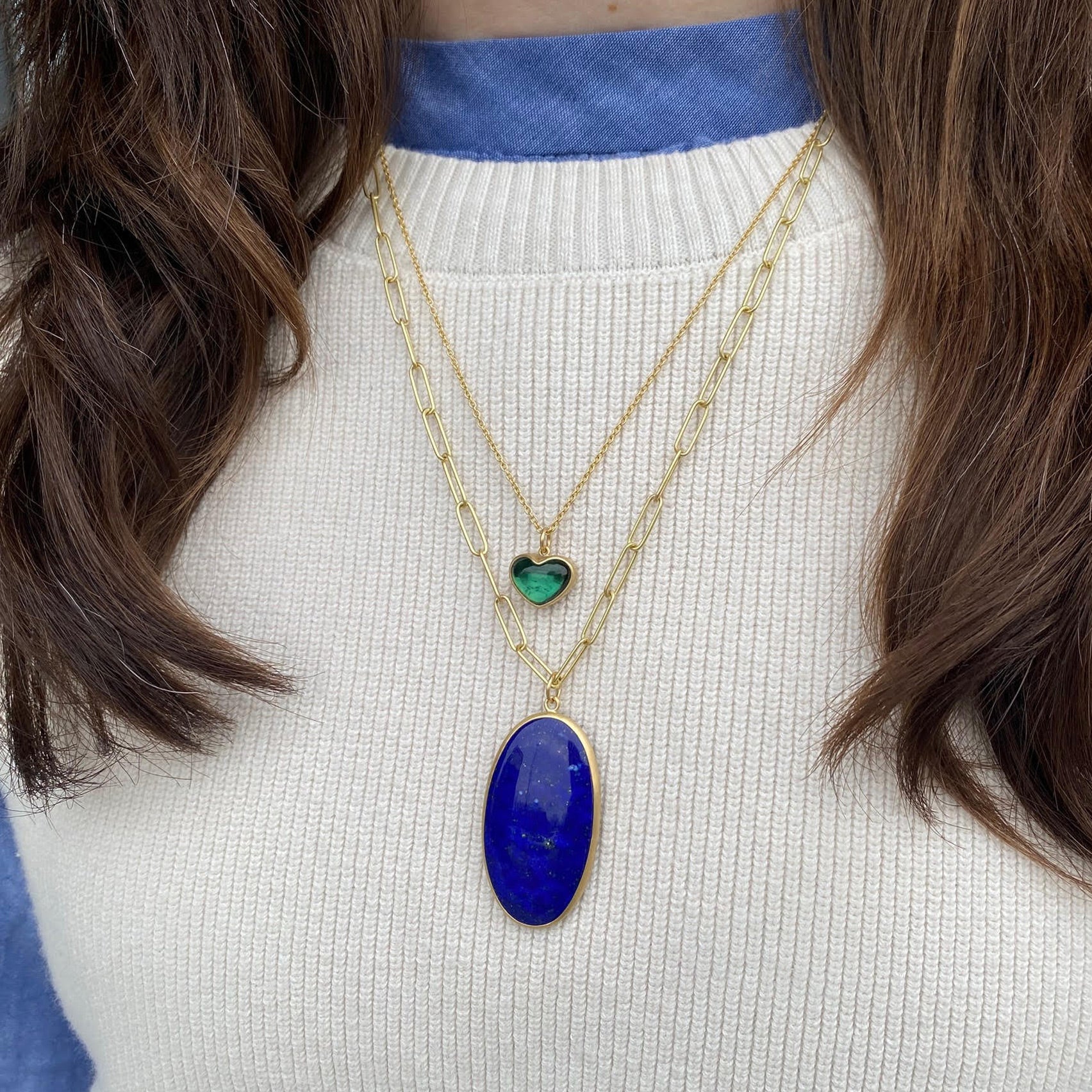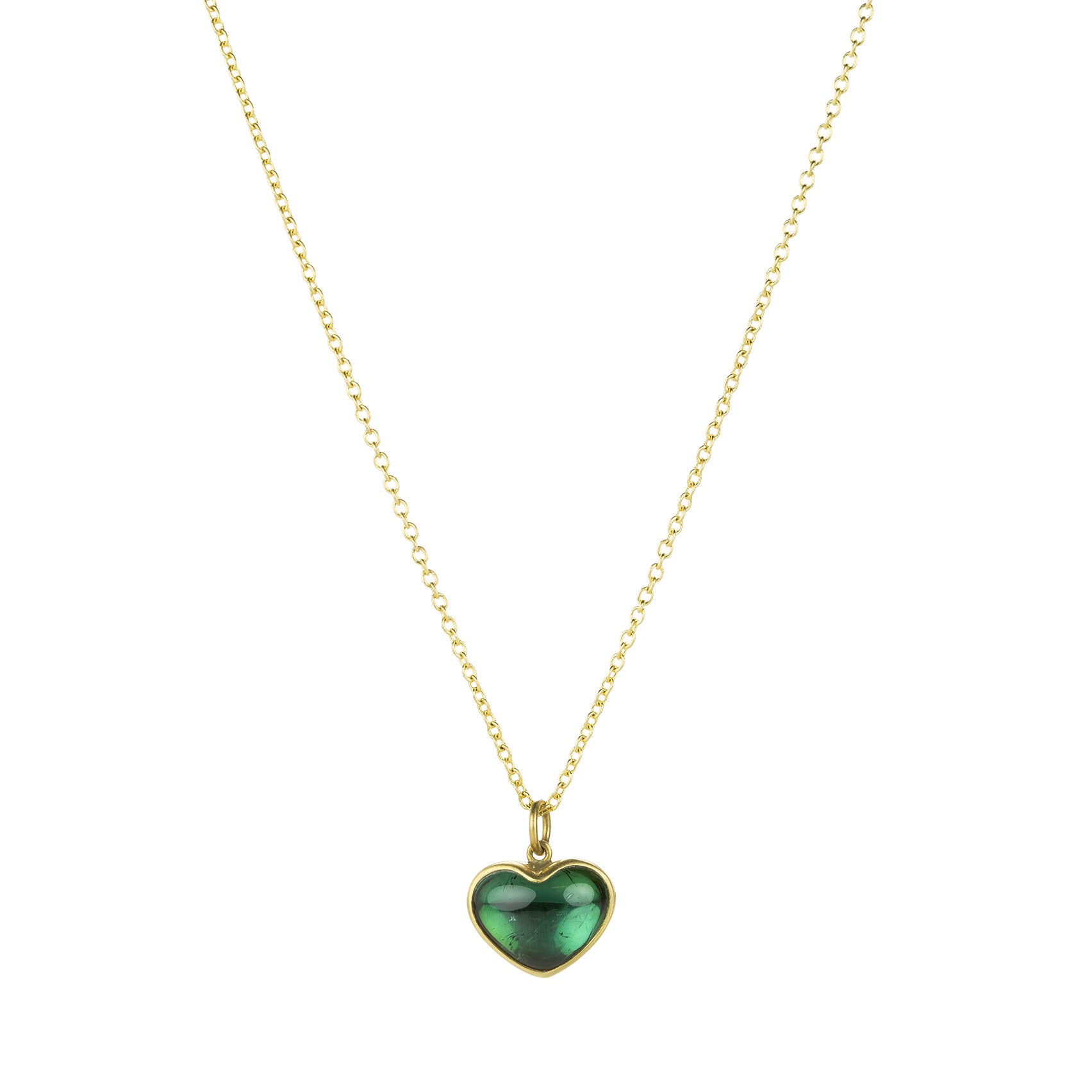 Infuse yourself with heart chakra energy in this 18k yellow gold necklace from Lola Brooks. A heart shaped 4.40ct green tourmaline cabochon is bezel set simply and hangs from a fine gold chain. Pendant measures just over 1/2“ in total length, including bail. Total length with lobster clasp measures 18”. Handcrafted in Lexington, GA, U.S.