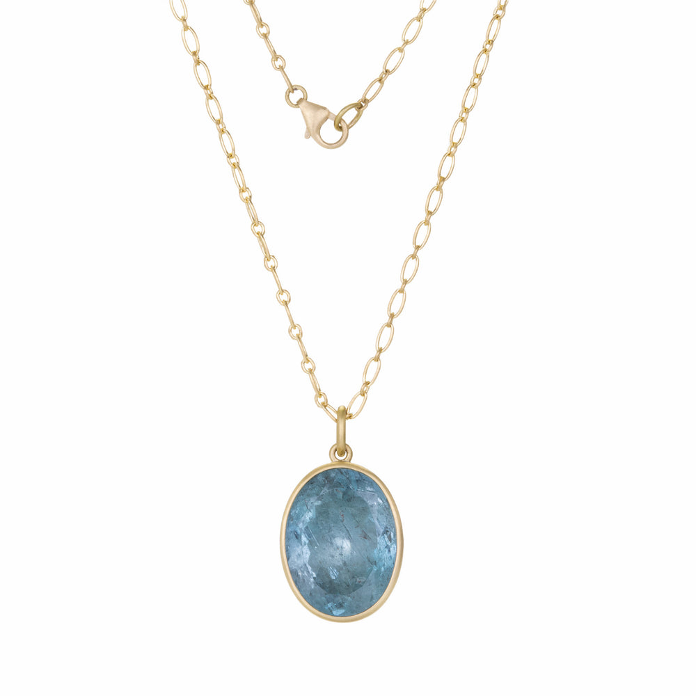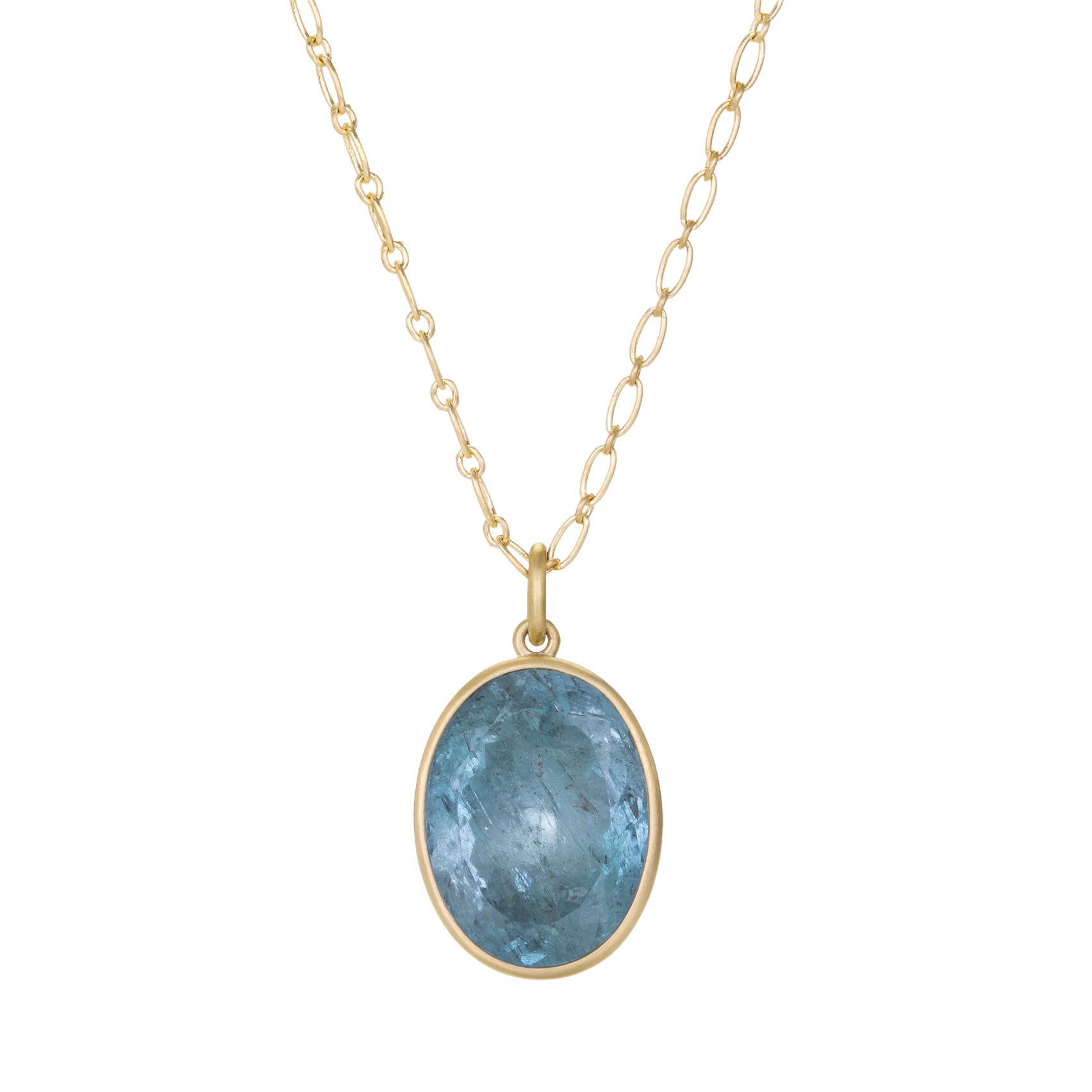 Take an endless dip in the deep blue bliss in this 18k yellow gold necklace from Lola Brooks. A 10.64ct oval aquamarine pendant is saturated with color and calm. The gorgeously faceted bezel set stone measures 7/8" x 5/8” with bail. Total chain length with a lobster clasp measures 18". Handcrafted in Lexington, GA, U.S.