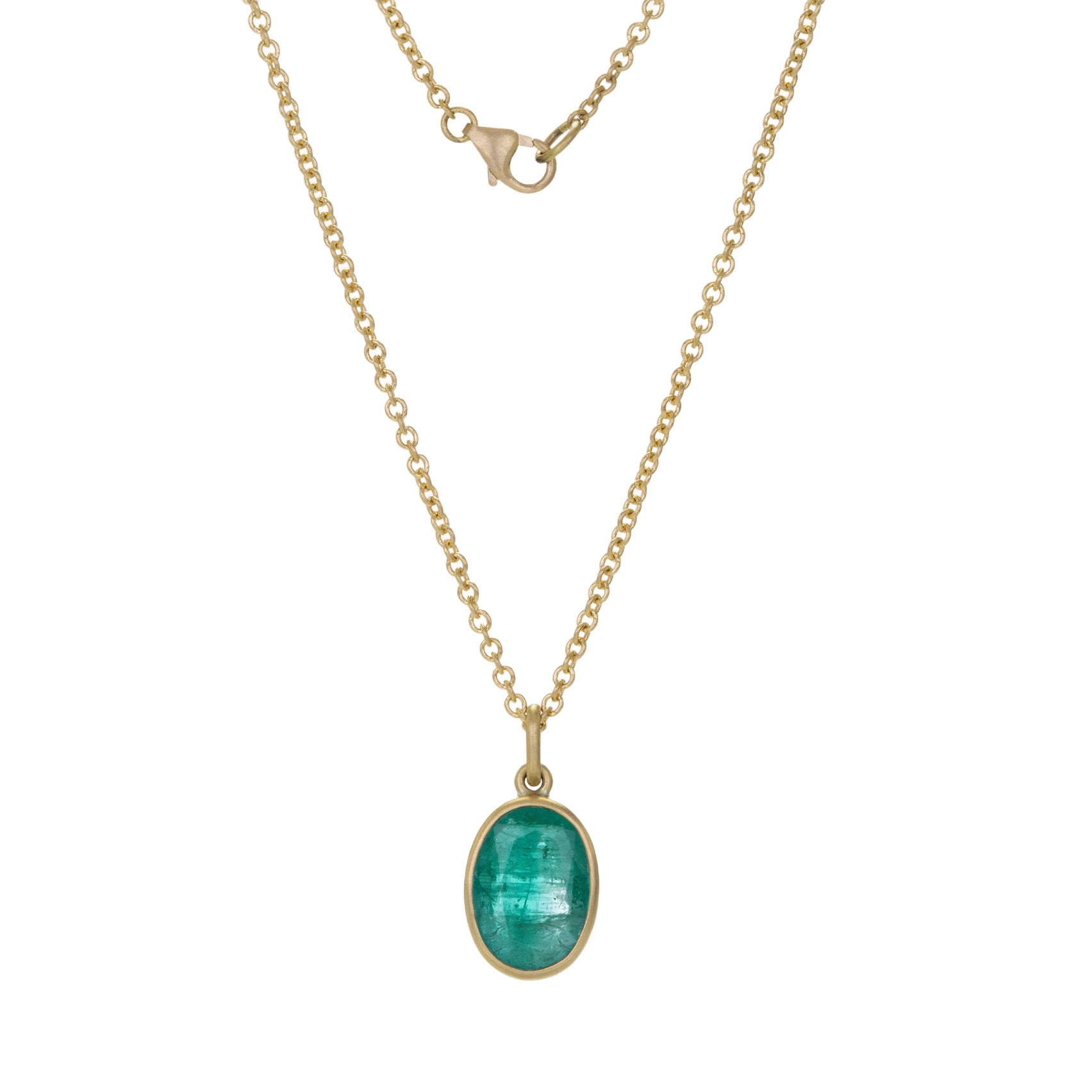 Add a precious pop of color to your necklace stack in this 18k yellow gold necklace from Lola Brooks. A glimmering oval 3.35ct Colombian emerald rings loud and clear, set in a simple brushed bezel of gold. Pendant measures 3/4" x 3/8" on an 18" chain with a lobster clasp. Handcrafted in Lexington, GA, U.S.