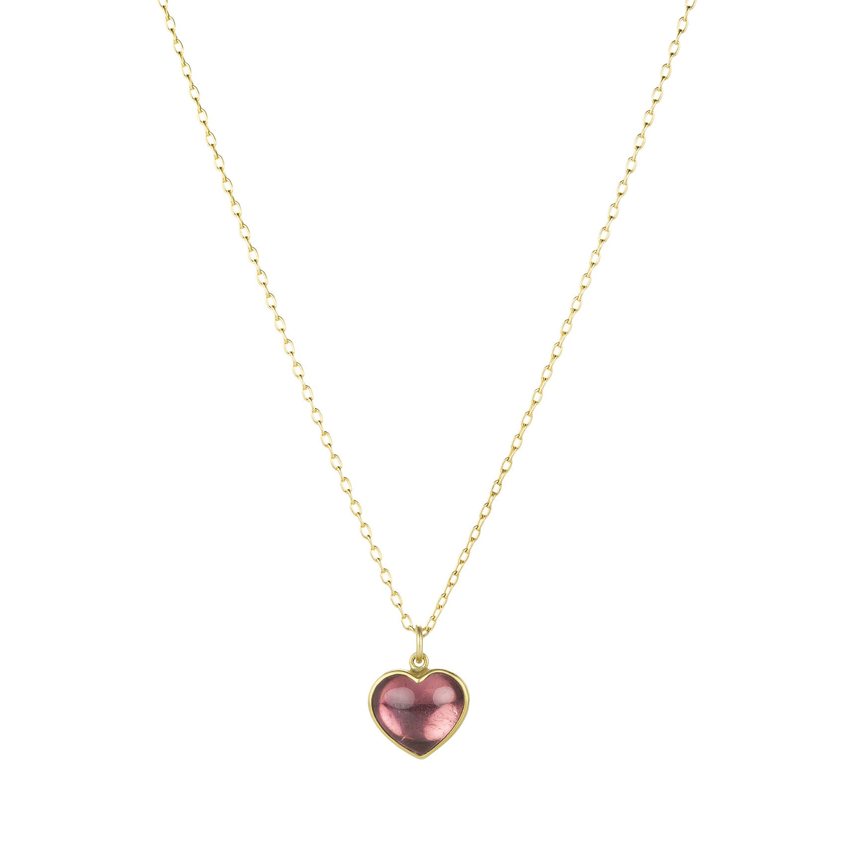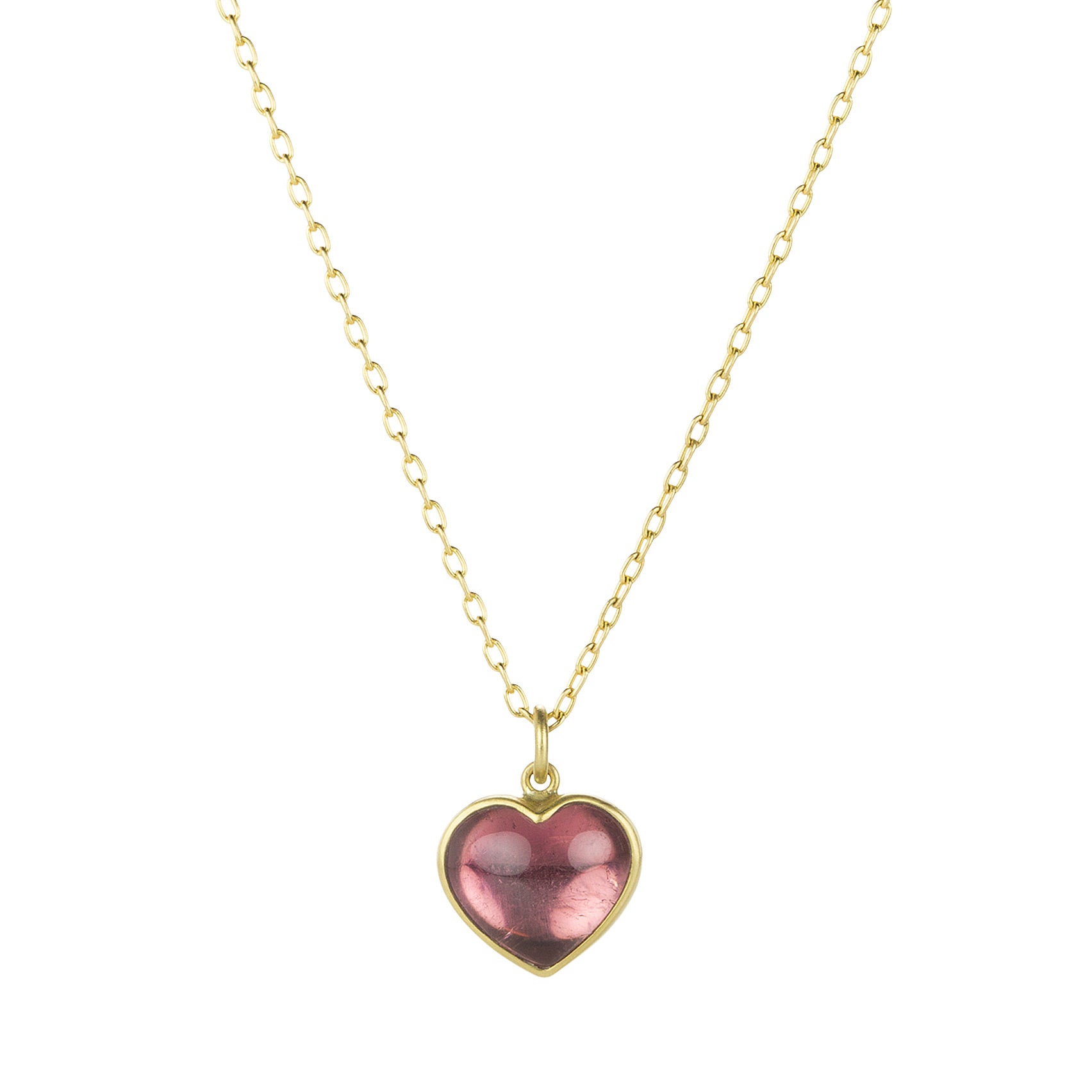 Infuse yourself with the passion of pink in this 18k yellow gold necklace from Lola Brooks. A heart shaped 2.99ct pink tourmaline cabochon is bezel set simply and hangs from a fine gold chain. Pendant measures just over 1/2“ in total length, including bail. Total length with lobster clasp measures 18”. Handcrafted in Lexington, GA, U.S.