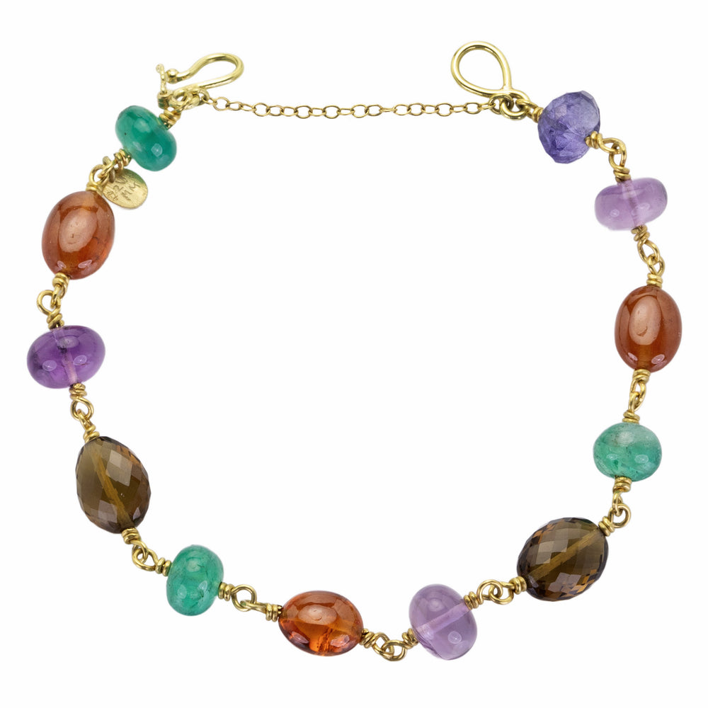 Wear a colorful array of earth’s creations in this absolutely luscious 22k yellow gold bracelet from Mallary Marks! This piece covers all the bases with a fun, versatile, luxurious style. Organically shaped tanzanite, amethyst, spessartite garnet, emerald and smoky quartz beads are carefully arranged and hand wrapped for a bold, comfortable feel. Total length with a hook clasp and safety chain measures 7". Handcrafted in New York, NY, U.S.