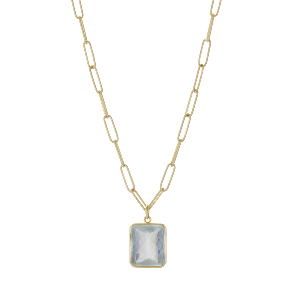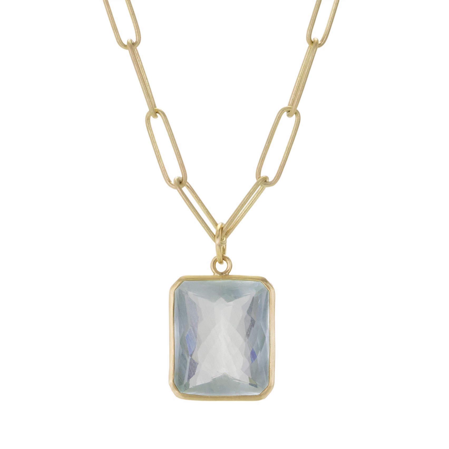 This 18k yellow gold Maria Beaulieu pendant features a watery, faceted rectangular aquamarine. The stone is simply bezel set to highlight its natural beauty. Pair it with one of the artist’s coveted handmade chains to complete the designer look. Pendant only, chain is sold separately. Stone measures 14 x 17mm. Total length measures 24mm including bail. Handcrafted in Brooklyn, NY, U.S.