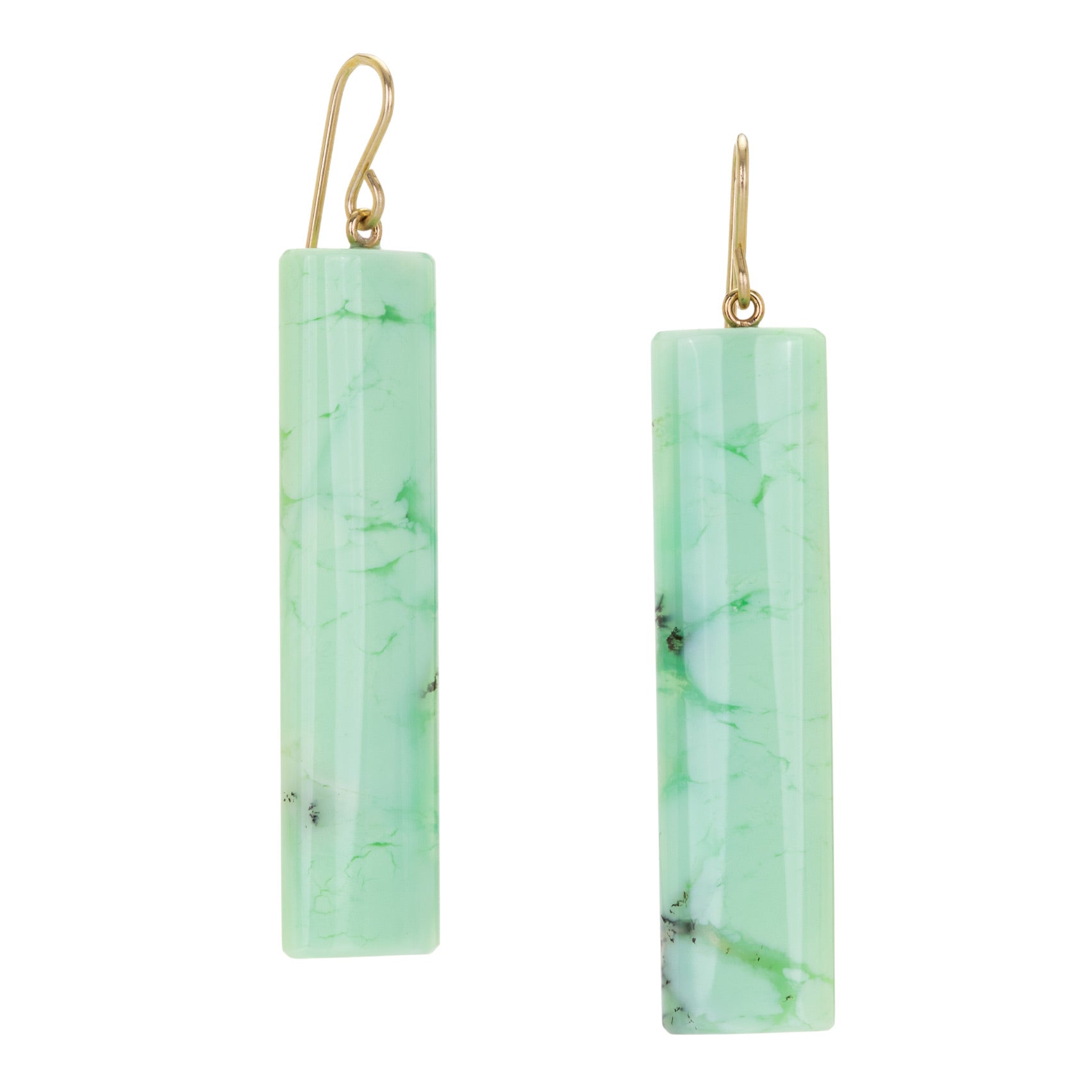 Keep things fresh with this pair of minty green drop earrings from Maria Beaulieu! The bright, bold design features elongated Australian chrysoprase bars, swinging freely from 18k yellow gold ear wires. Stones measure 11 x 43mm. Total length with 18k yellow gold curved ear wires measures 2”. Handcrafted in Brooklyn, NY, U.S.