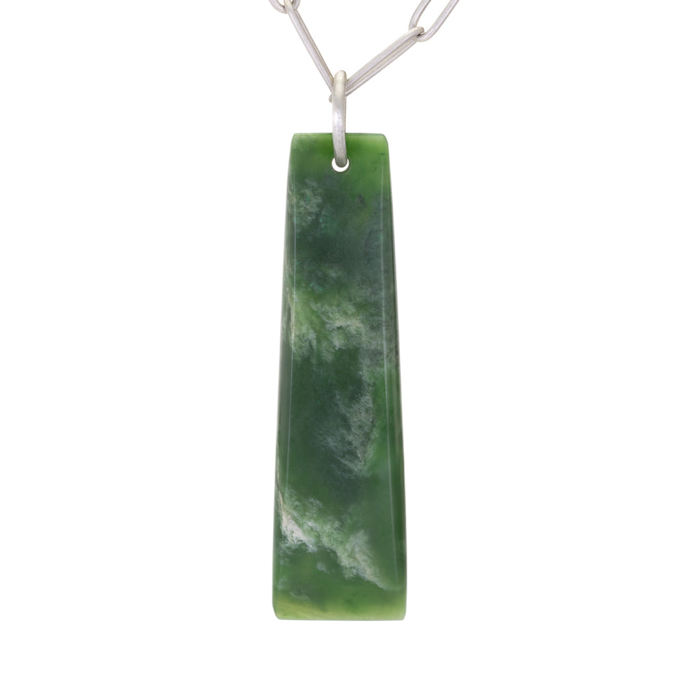 Blend ancient and modern with a minimalist twist in this Cassiar jade pendant from Maria Beaulieu. The stone tool pendant features a large sterling silver bail. Pair it with one of the artist’s handmade chains for the complete designer look! Stone measures 21mm x 78mm. Total length measures 3 3/8". Pendant only, chain is sold separately. Handcrafted in Brooklyn, NY, U.S.
