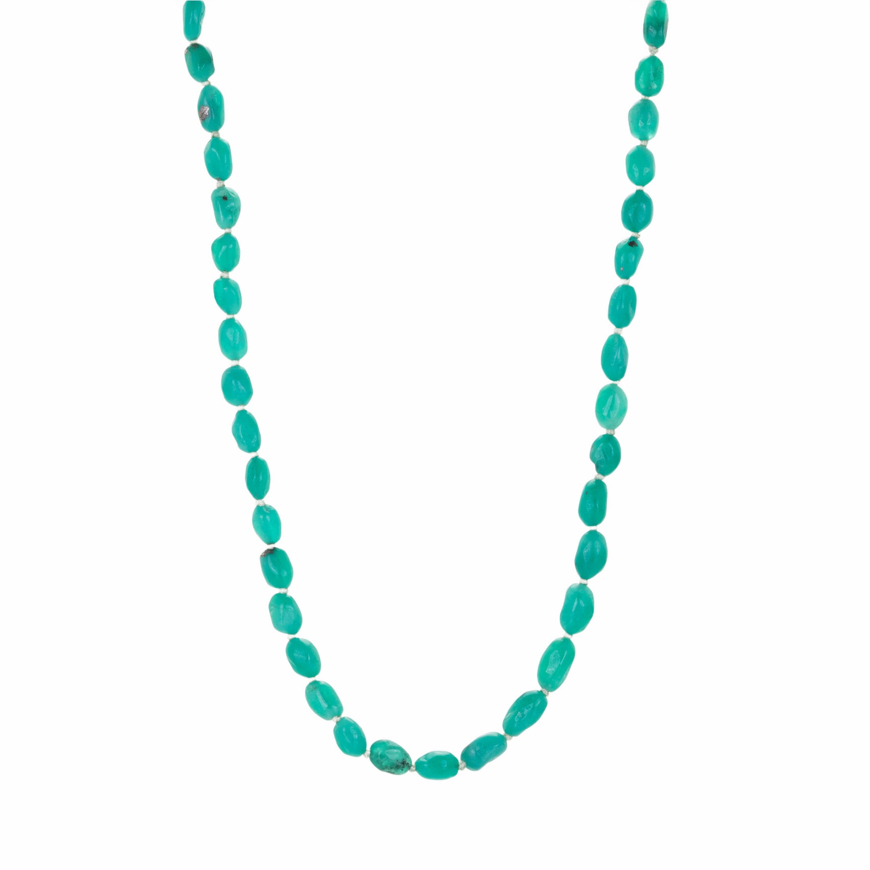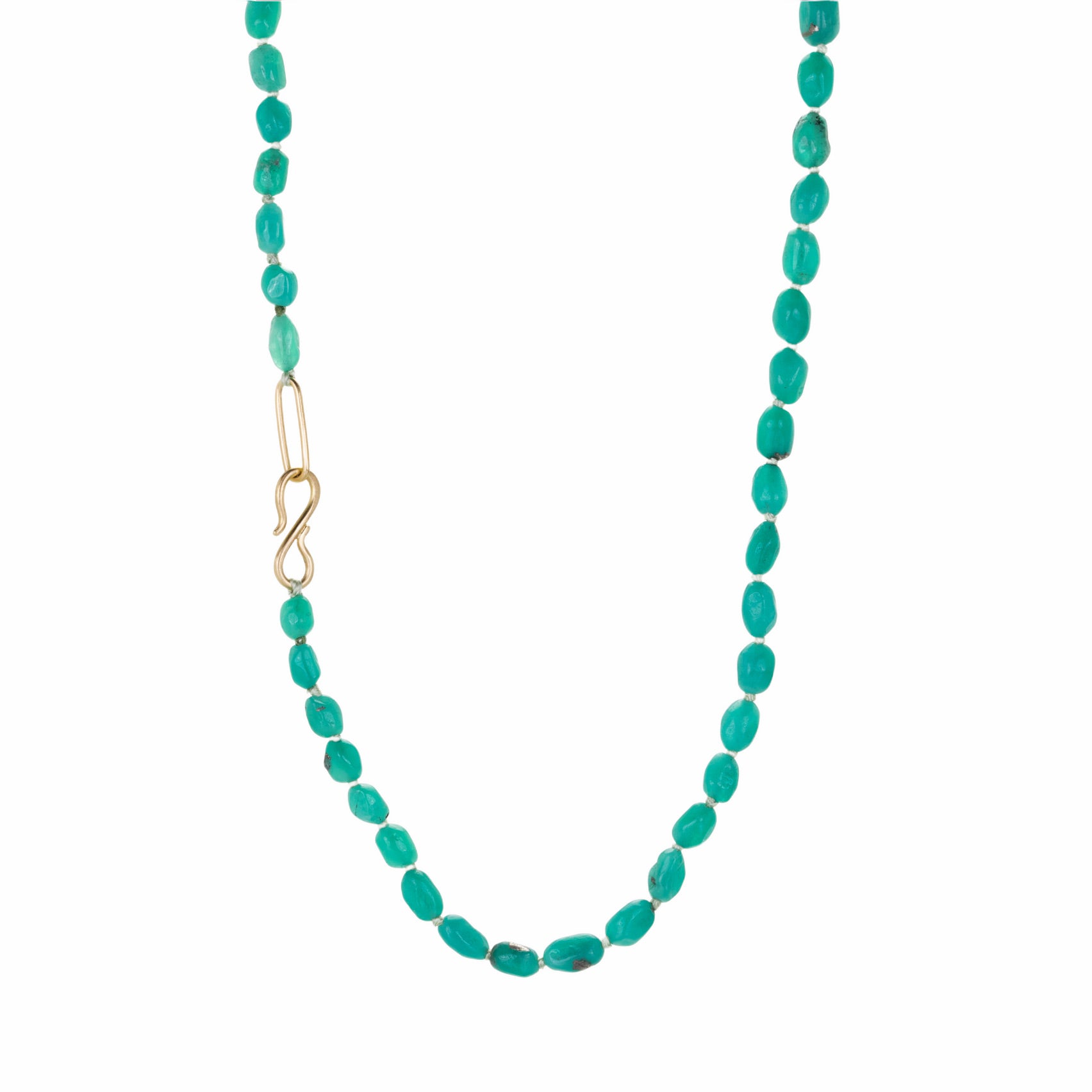 Carefully selected Colombian emerald beads comprise this hand tied necklace from Maria Beaulieu, rich in movement and depth. Layer a drape of precious gemstone color into your look! Knotted on light green silk cord with an 18k yellow gold s-hook clasp, the total length measures 17 3/4“. Handcrafted in Brooklyn, NY, U.S.