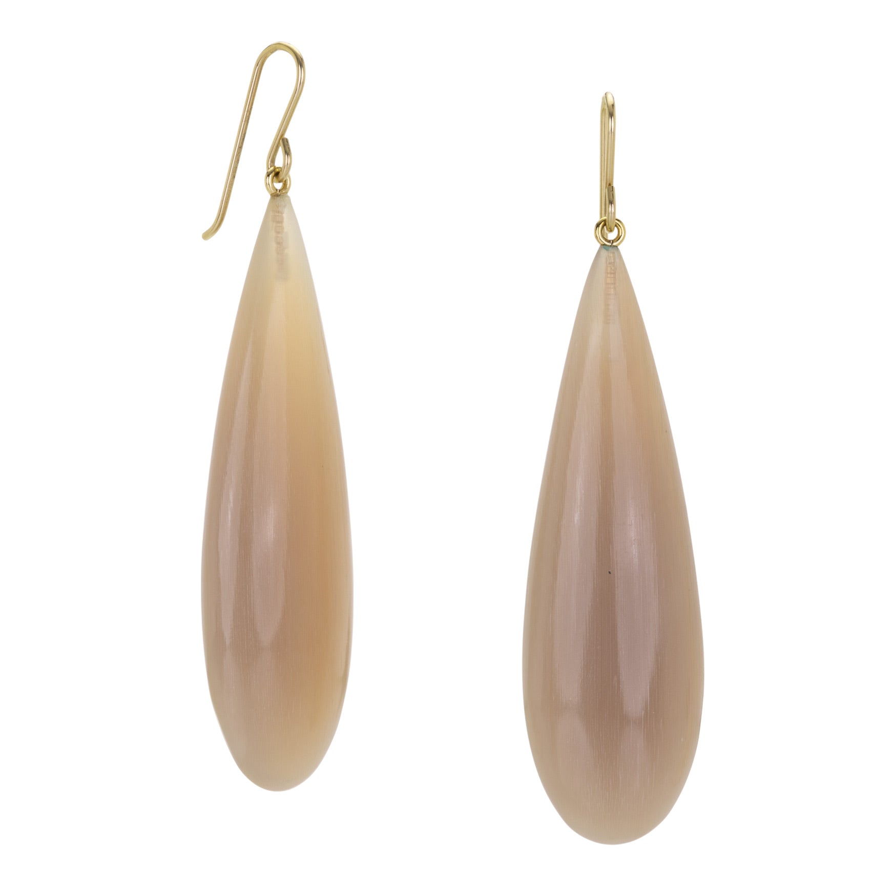 Dripping in earthy elegance, these bold, 18k yellow gold drop earrings from Maria Beaulieu will warm the soul. The luscious, glowing light brown horns are polished butter smooth. Stones measure 15mm x 49mm. Earrings measure 2 1/4” in length with curved ear wires. Handcrafted in Brooklyn, NY, U.S.