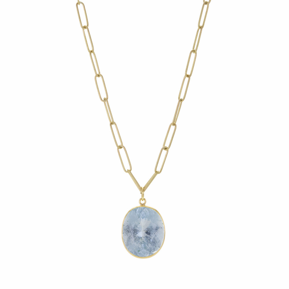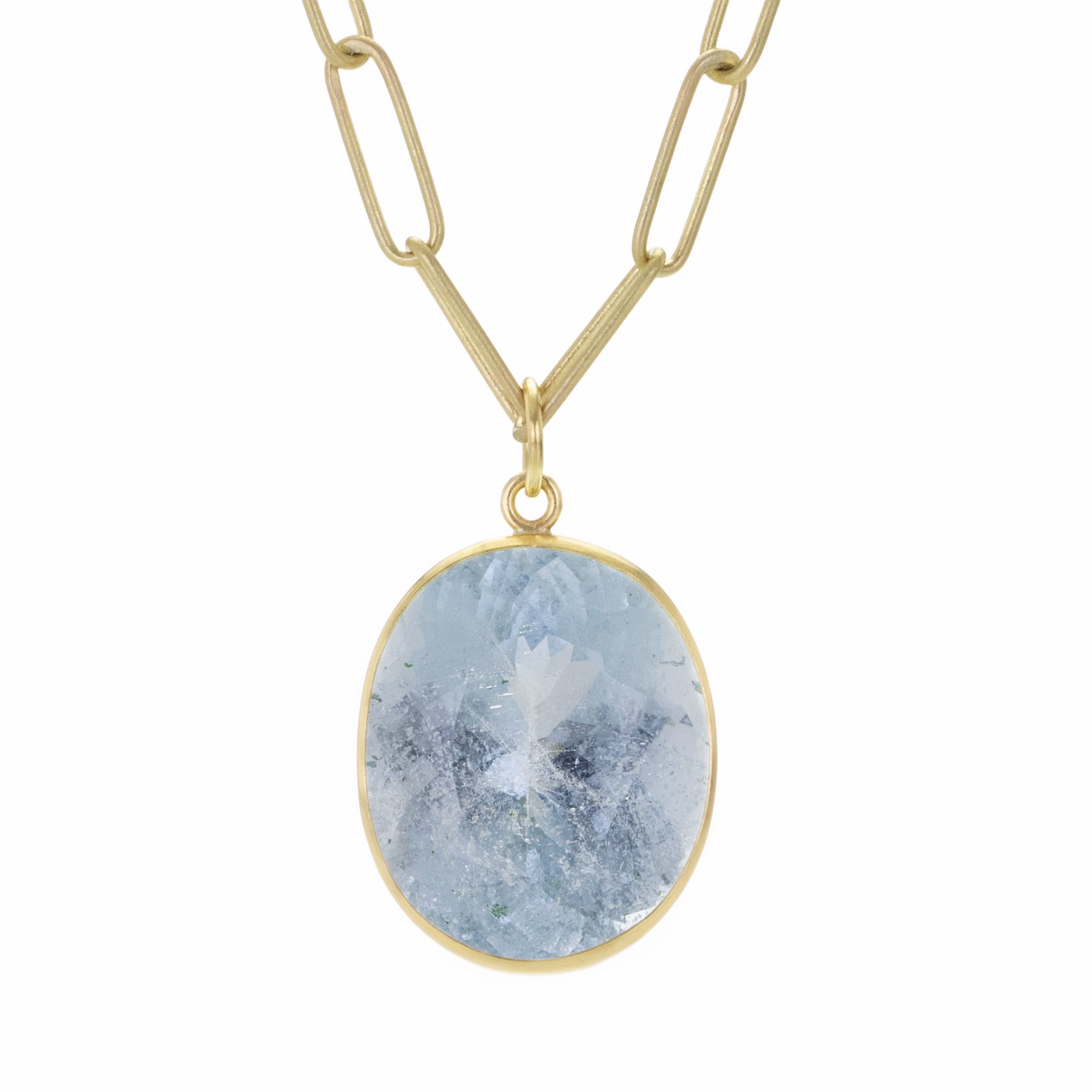 This sweet Maria Beaulieu pendant is faceted to icy perfection. The fine oval aquamarine is framed in a minimal 18k yellow gold bezel that highlights the stone's natural beauty. Whether worn alone, or in a cluster of charms, this pendant is simply stunning! Pendant measures 17mm x 21mm. Pair it with one of Maria's coveted handmade gold chains to complete the designer look! Total length measures 28mm including bail. Pendant only, chain is sold separately. Handcrafted in Brooklyn, NY, U.S.