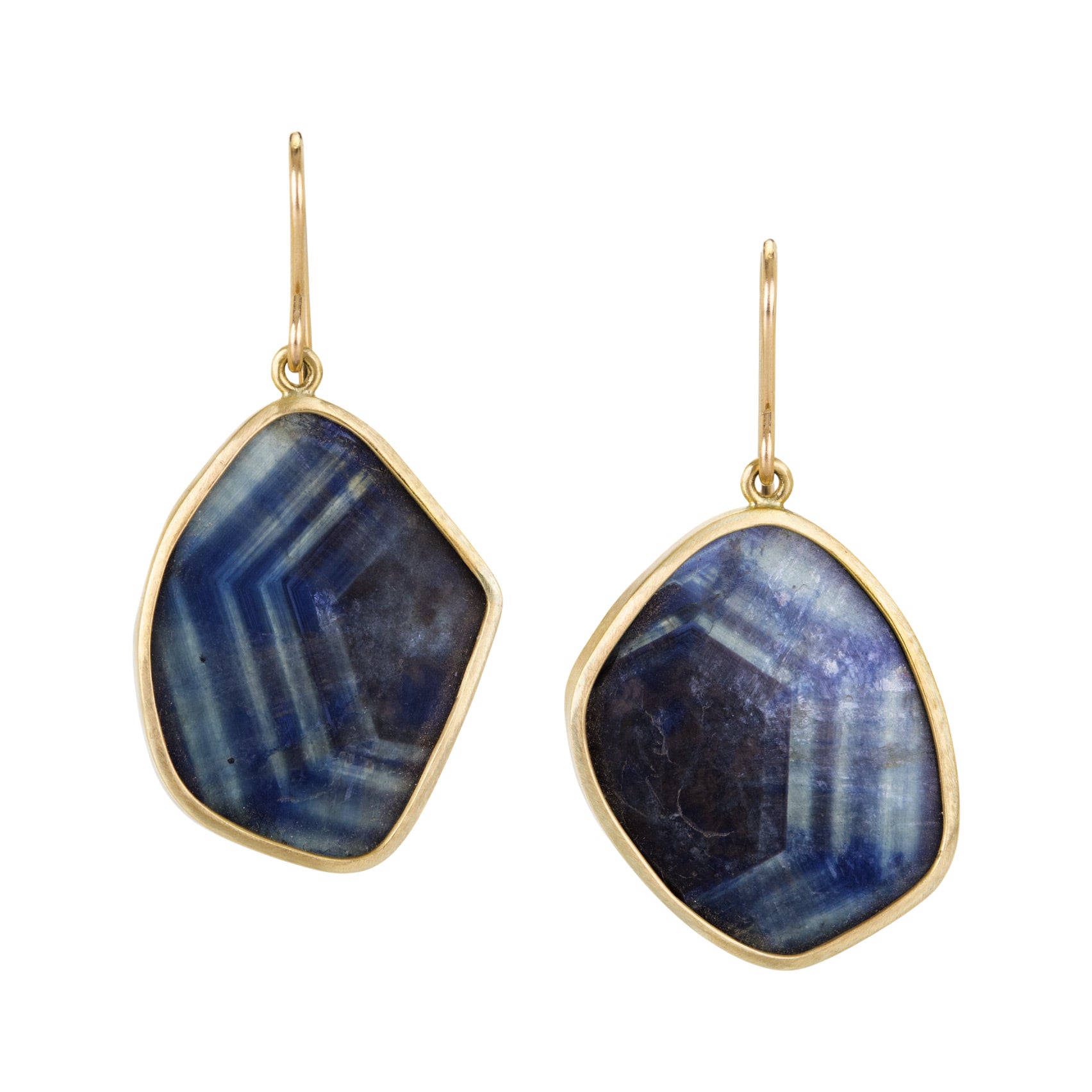 Uniquely enchanting, this pair of 18k yellow gold earrings from Maria Beaulieu features bezel set blue sapphire slabs. The deep blue freeform stones display fantastic crystal structure and color gradient. Total length with curved ear wires measures 1 1/2". Handcrafted in Brooklyn, NY, U.S.