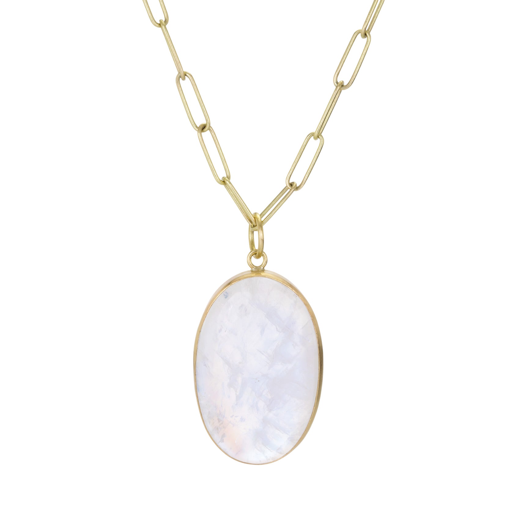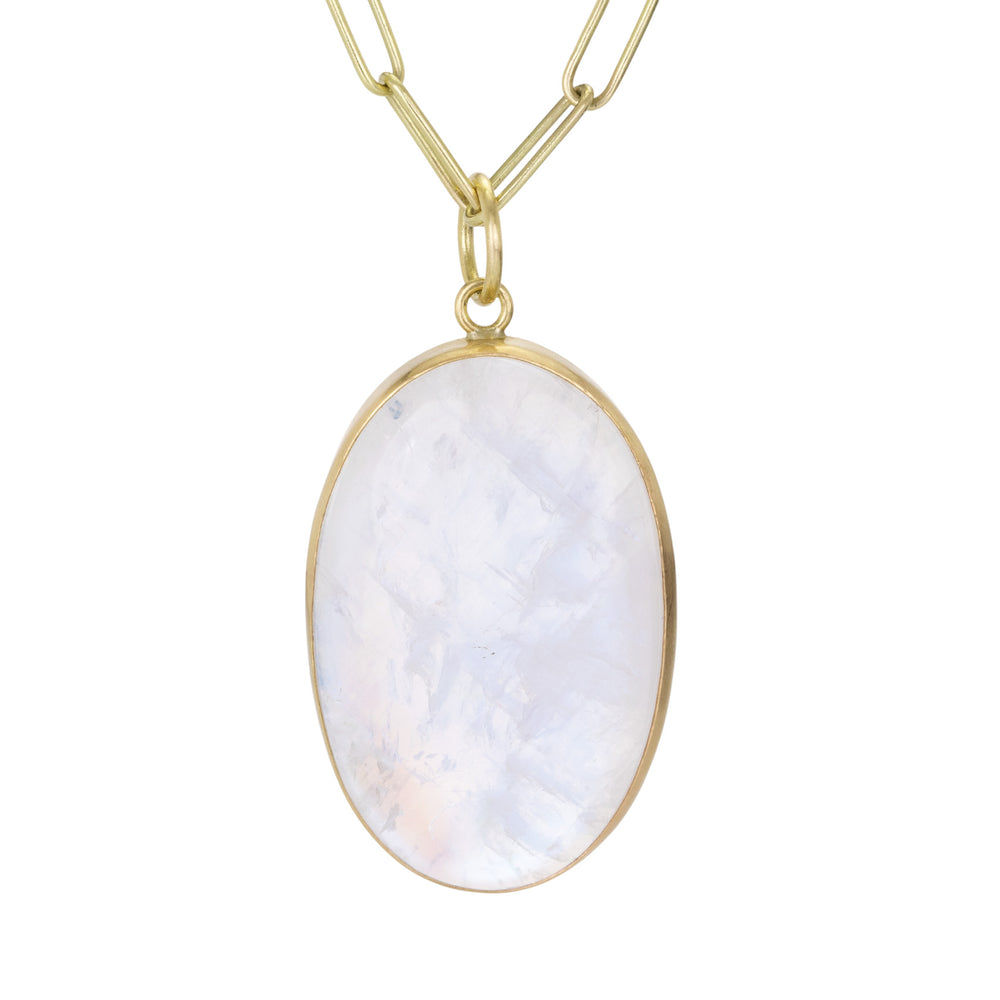 Channeling feminine energy and the goddess within, moonstone is a mutable, versatile stone that we consider an absolute fave. This 18k yellow gold pendant from Maria Beaulieu features an oval moonstone cabochon, smooth and luminous with every twist and turn. Set in a minimalist bezel, the stone is free to fully shine! Pair it with your favorite chain, or one of the artist’s coveted handmade chains to complete the designer look. Total length measures 1 3/4". Pendant only, chain is sold separately. Handcrafted in Brooklyn, NY, U.S.