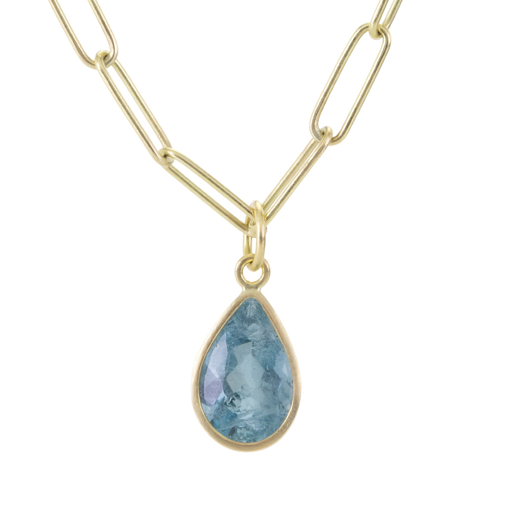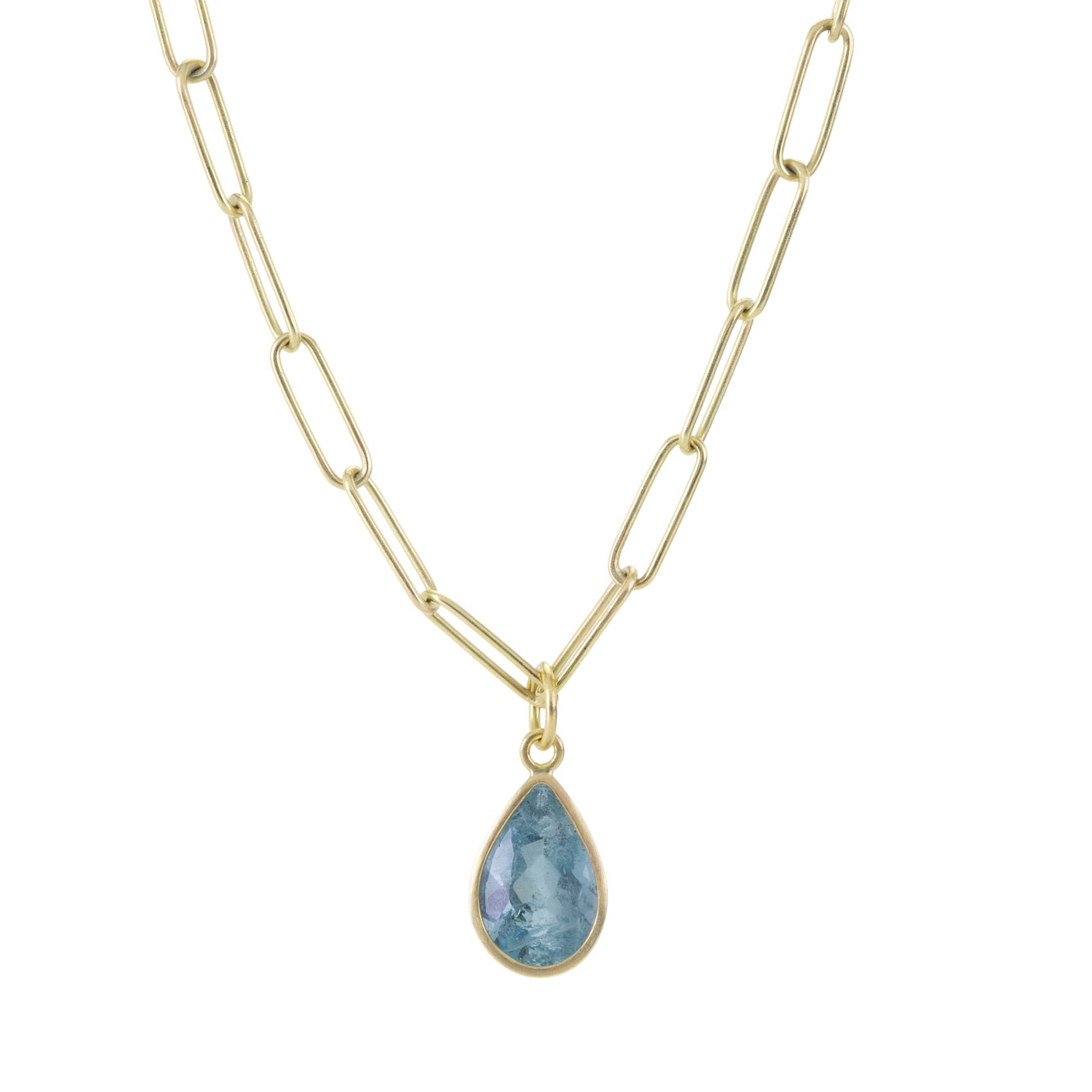 Like an infinite drop of water from the sea, this faceted pear shaped aquamarine pendant sparkles and shines with wonder. Simply bezel set in 18k yellow gold, Maria Beaulieu intends to let nature’s gifts take center stage. This piece is perfect for the mermaid at heart! Total length measures 7/8“ including the bail. Pair it with your favorite chain, or with one of the artist’s coveted handmade chains to complete the designer look. Chain sold separately. Handcrafted in Brooklyn, NY, U.S.