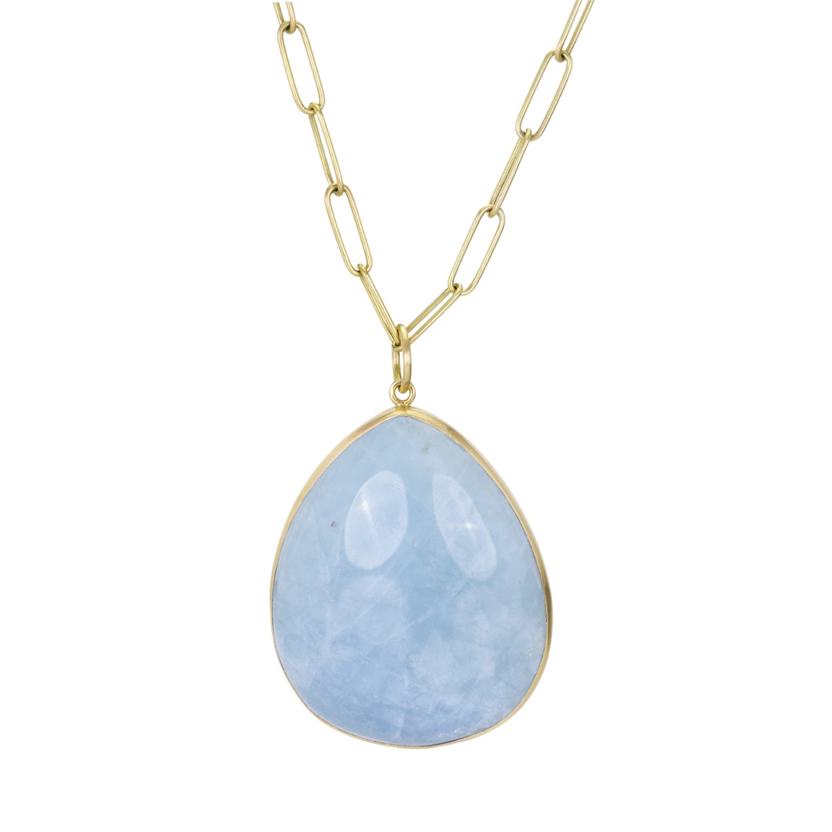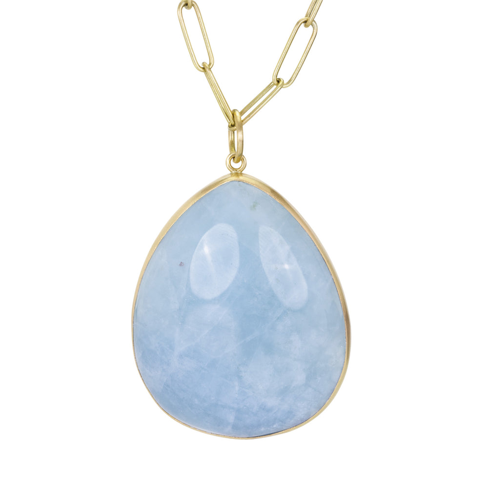 As beautiful and mysterious as a mermaid's tear, this Maria Beaulieu aquamarine pendant may have you crying tears of joy! The milky cabochon stone is bezel set in 18k gold and exhibits the flashes and depths of a coral sea. Pair it with one of the artist’s available handmade chains for the complete designer look. Total length measures 2". Pendant only, chain is sold separately. Handcrafted in Brooklyn, NY, U.S.
