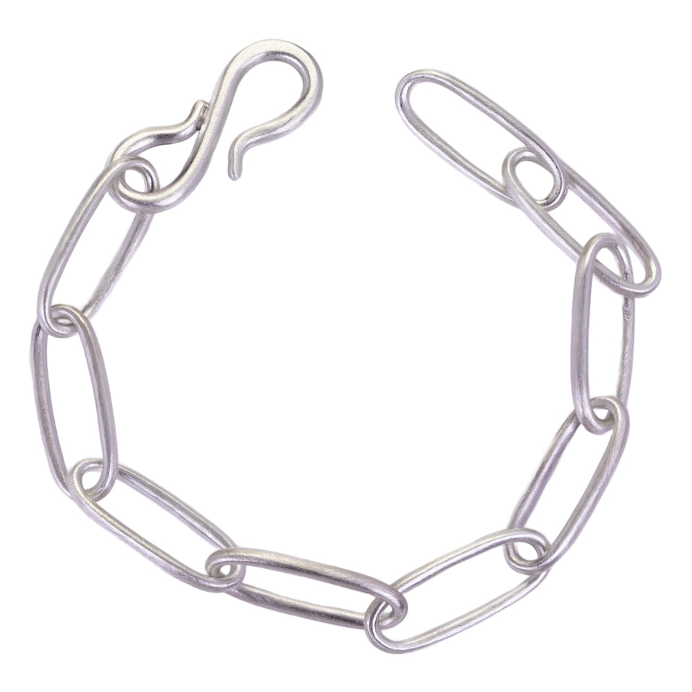 This highly coveted handmade chain from Maria Beaulieu has been measured to bracelet length, a perfect companion to one of the artist’s necklaces and one of a kind pendants. Crafted in sterling silver, this ultra heavyweight piece is strong, organic and luxurious. Treat yourself! Total length with XL clasp measures 7 1/2”. Handcrafted in Brooklyn, NY, U.S.