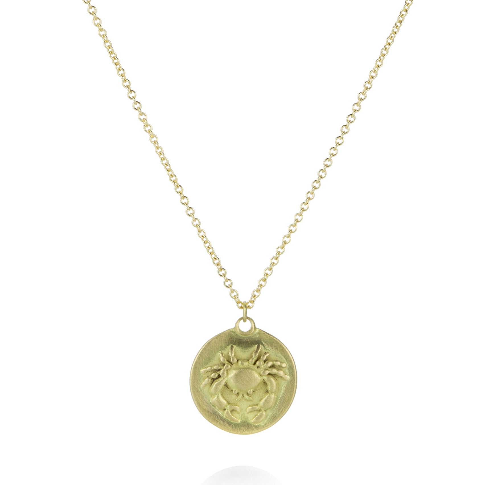 Calling all Cancerians! This 18k yellow gold necklace from Marian Maurer celebrates you with a round, brushed, hand carved Cancer pendant. Ruled by the Moon and the element of water, those born under this sign are intuitive, emotional, compassionate and intelligent. Pendant measures approximately 1/2" in diameter on a 16" chain. Handcrafted in Brooklyn, NY, U.S.