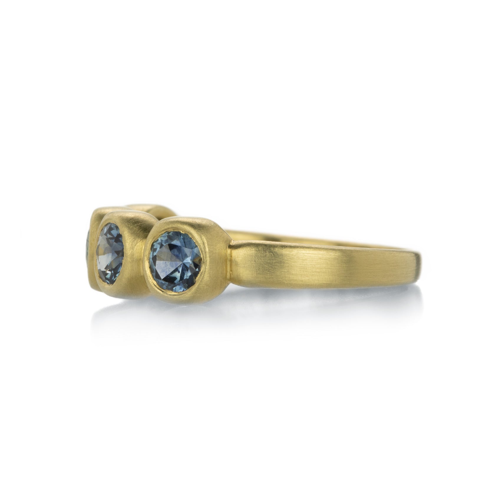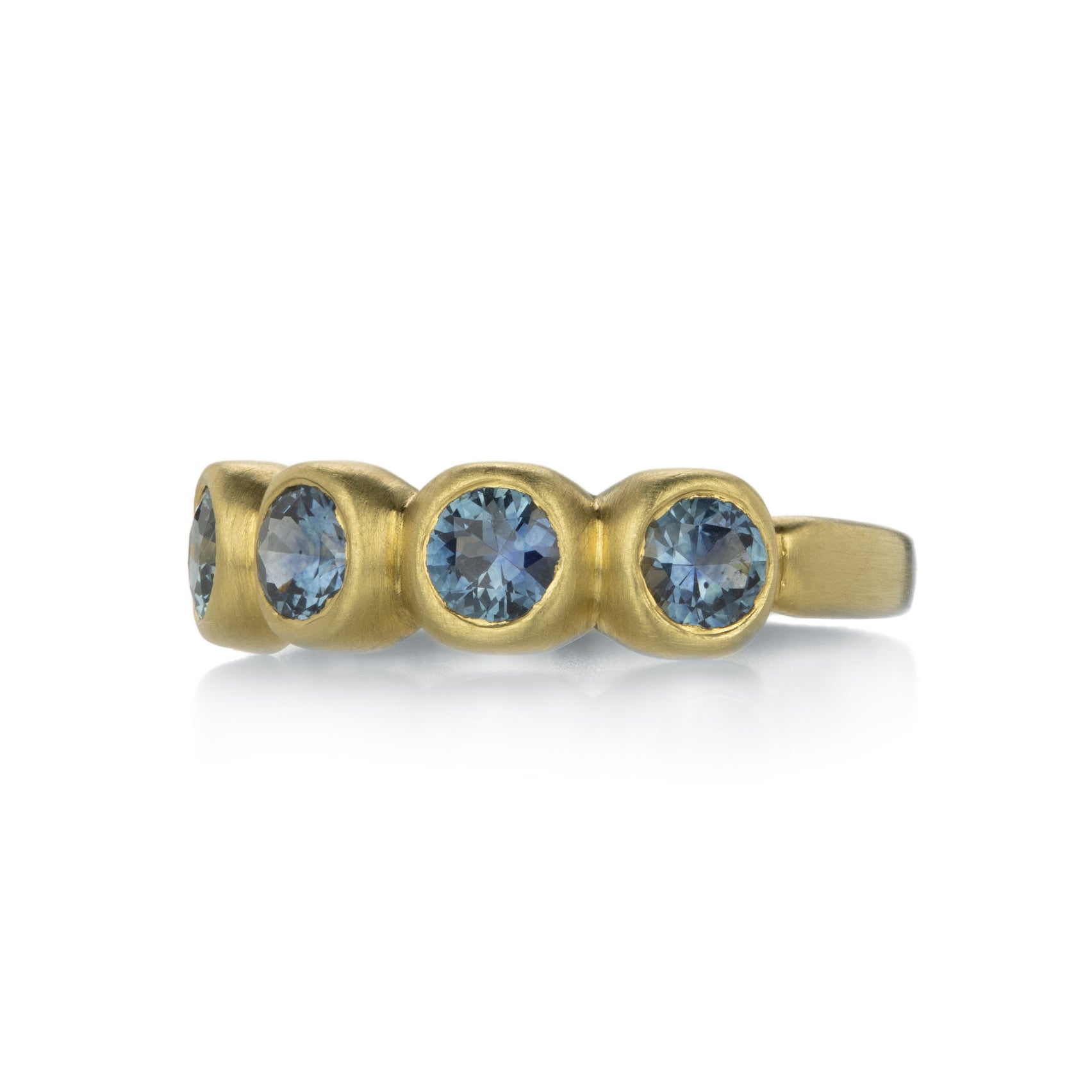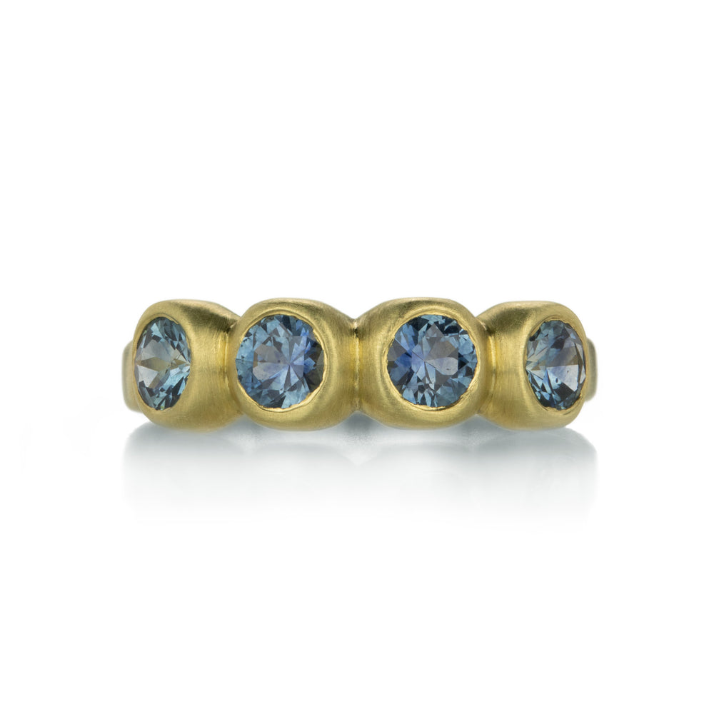 Not for the faint of heart, this large, 18k yellow gold ring from Marian Maurer features four 4mm medium blue Montana sapphires, organically bezel set in a chunky, satiny band of gold. Size 6.75. Handcrafted in Brooklyn, NY, U.S.