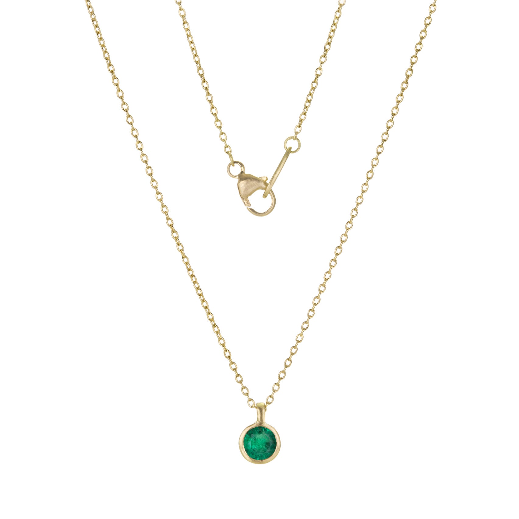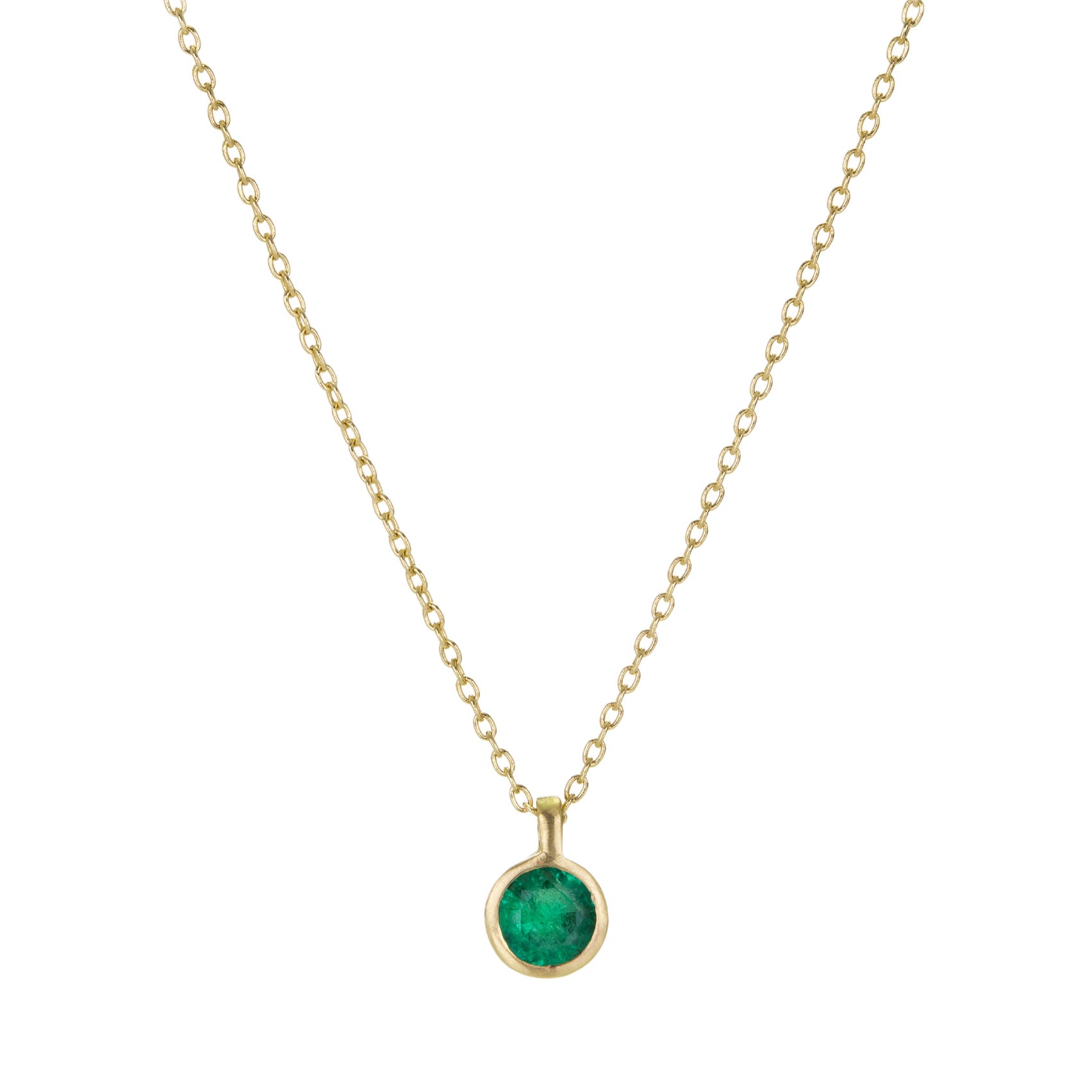 Perfect for the May baby, this charmed 18k yellow gold necklace from Marian Maurer features a 4mm bezel set emerald on a fine cable chain. Great for layering or as a sweet, simple everyday staple. Pendant measures 1/4". Total chain length with lobster clasp measures 16”. Handcrafted in Brooklyn, NY, U.S.