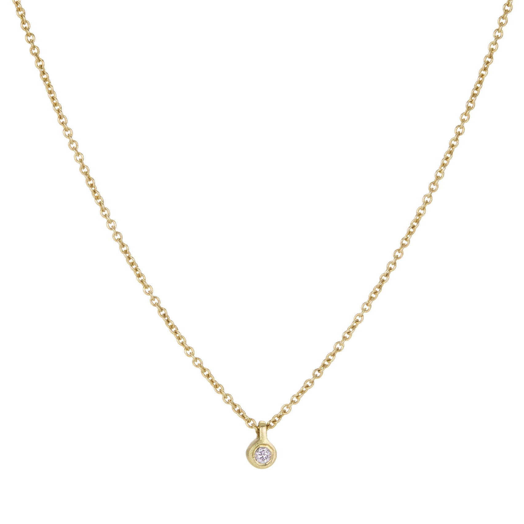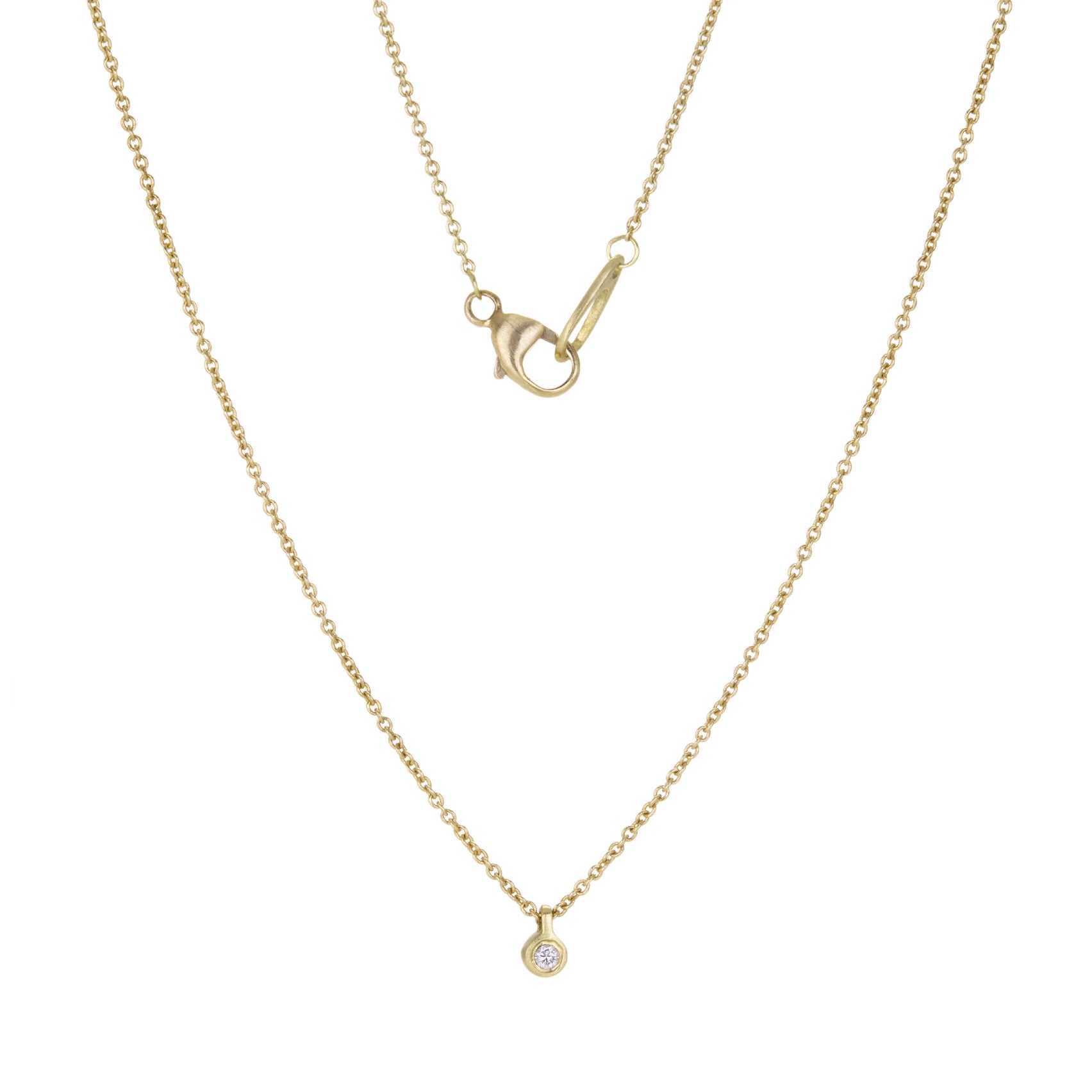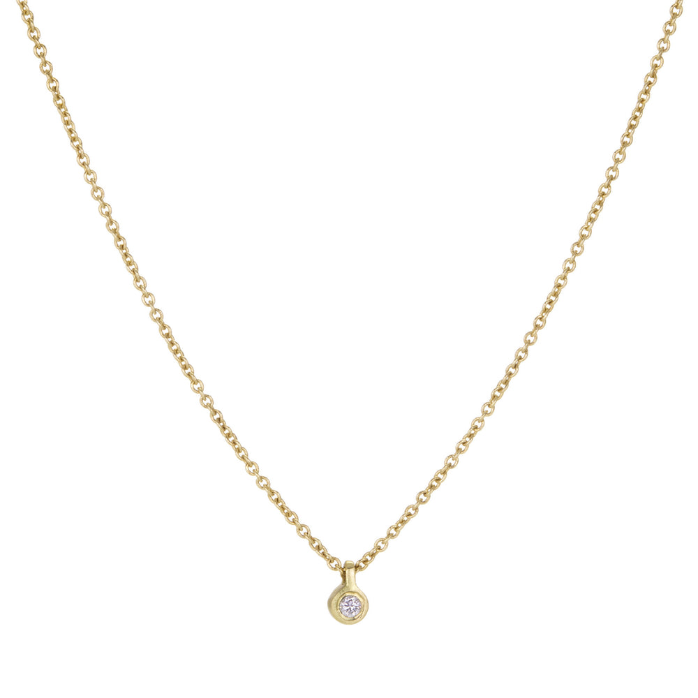 Let your love for sparkle shine in this charmed 18k yellow gold necklace from Marian Maurer! A 0.02ct bezel set white diamond hangs on a fine cable chain, perfect for layering or as a sweet, simple everyday staple. Total chain length with lobster clasp measures 16”. Handcrafted in Brooklyn, NY, U.S.